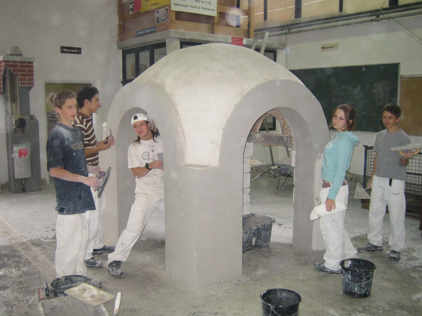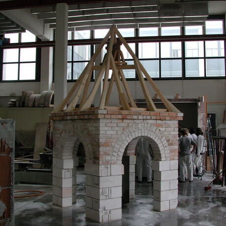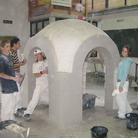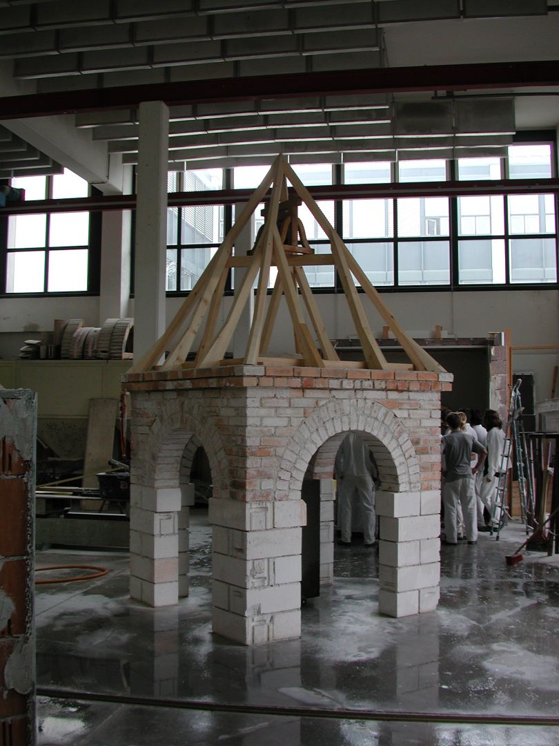 Um den Schüler*innen die Möglichkeiten von modernen Raumüberdeckungen wie Stahlbetondecken o.ä. und ihr Unterschiede zu alter Baukunst näher zu bringen, werden in der Mauerei auch noch Ziegelgewölbe hergestellt. Hierbei werden Mauerwerkspfeiler in einem quadratischen Grundriss gemauert und die Maueröffnungen mit Rundbögen überspannt. Anschließend werden die Rundbögen in Form eines Kugelgewölbes übermauert. Das Besondere daran ist, dass das Gewölbe ohne Schalung und sozusagen freitragend gemauert werden kann.