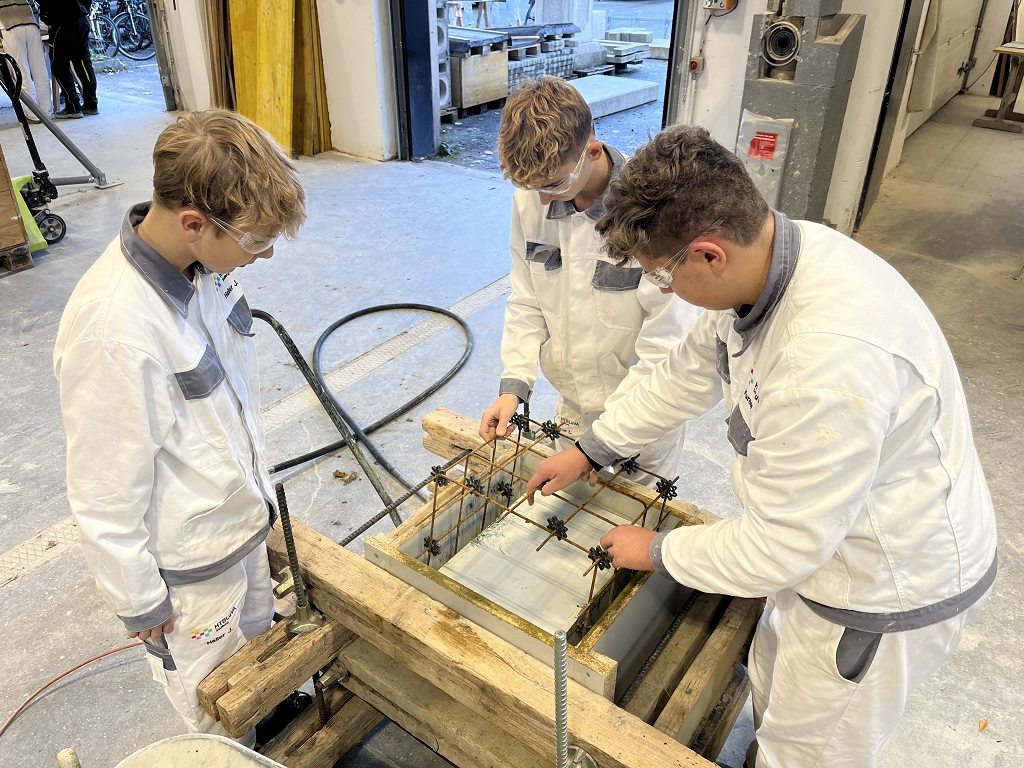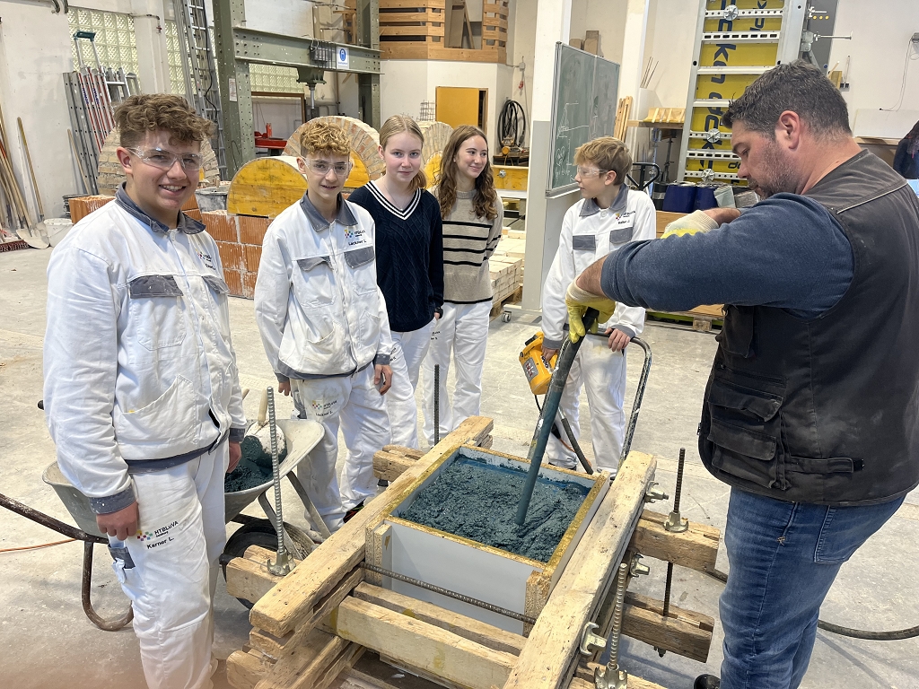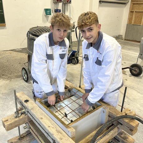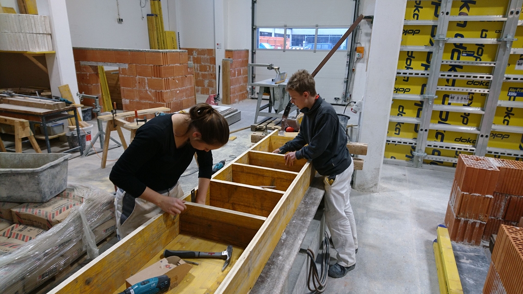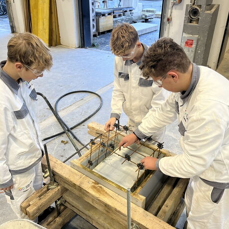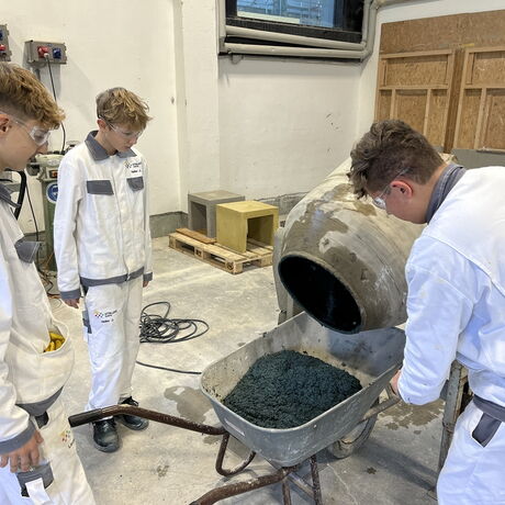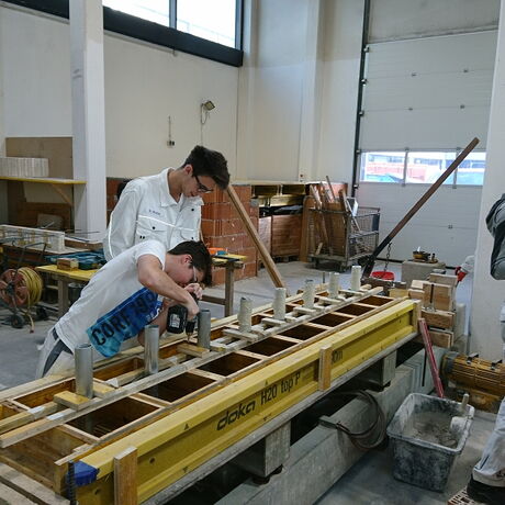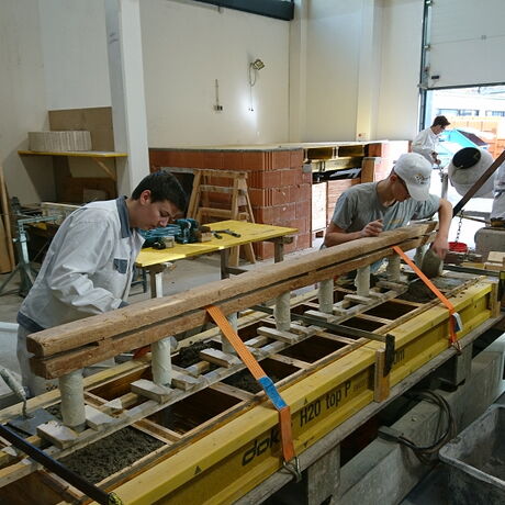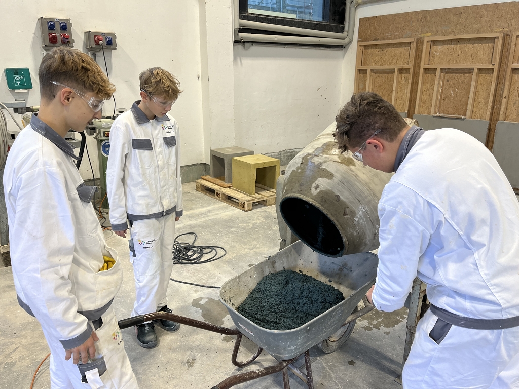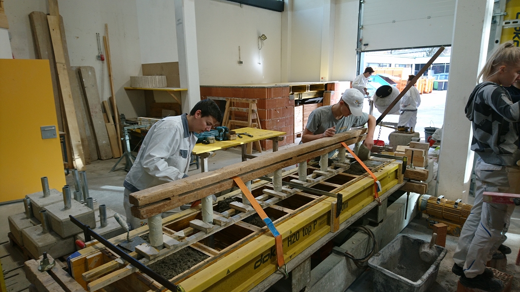 In den weiteren Arbeitsschritten werden von den Schüler*innen unter Anleitung der Fachlehrer die Betonfertigteile eingeschalt und bewehrt. Die erforderliche Betonmenge und Betongüte wird berechnet bzw. festgelegt. Anschließend wird der Beton nach Rezept gemischt, eingebaut und nachbehandelt.