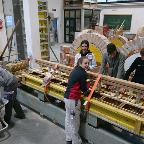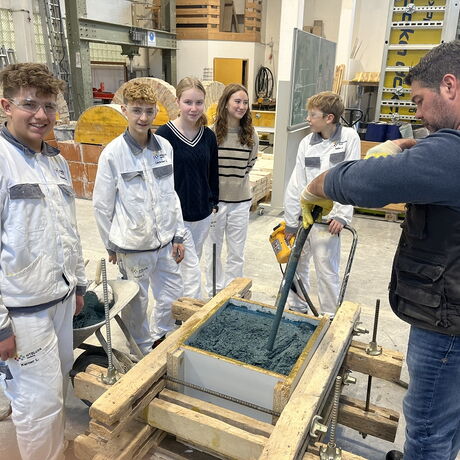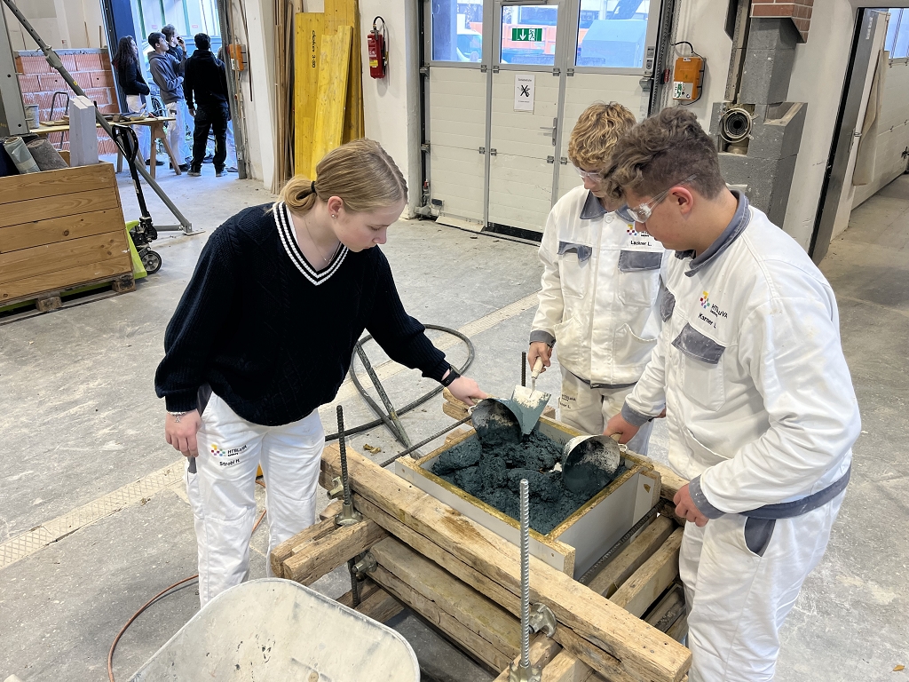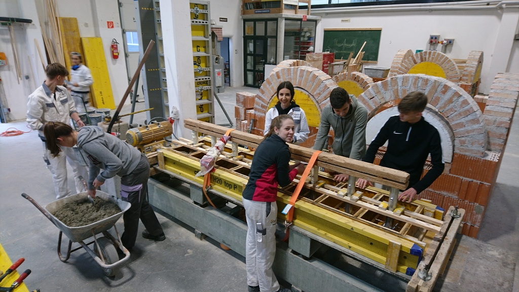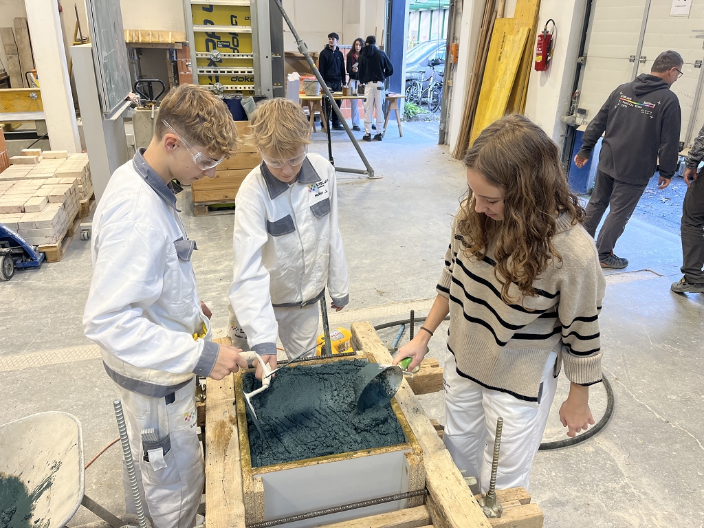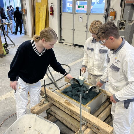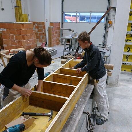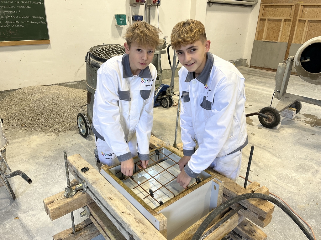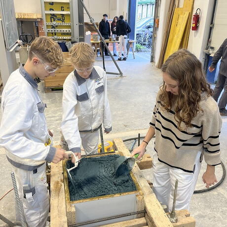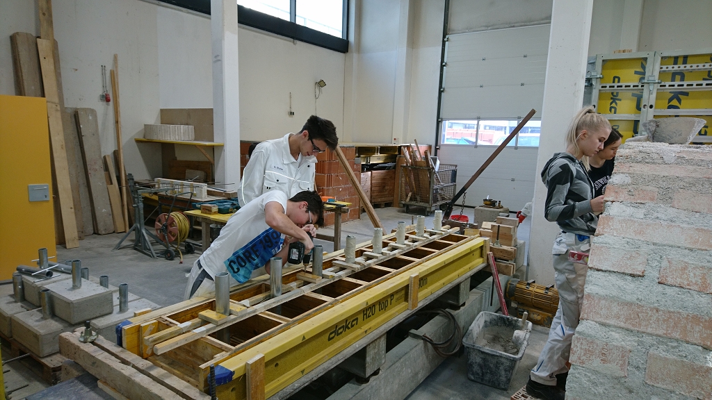 In den weiteren Arbeitsschritten werden von den Schüler*innen unter Anleitung der Fachlehrer die Betonfertigteile eingeschalt und bewehrt. Die erforderliche Betonmenge und Betongüte wird berechnet bzw. festgelegt. Anschließend wird der Beton nach Rezept gemischt, eingebaut und nachbehandelt.