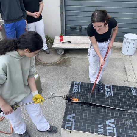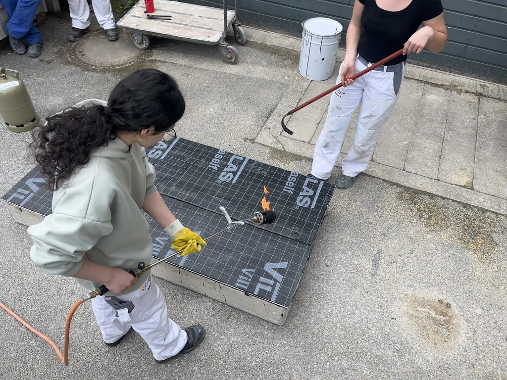 Im fachpraktischen Unterricht werden unterschiedliche Bitumenbahnen sowie deren Anwendungsmöglichkeiten und Verarbeitungsweisen wie das Kaltselbstklebeverfahren und das Schweißverfahren angewendet.