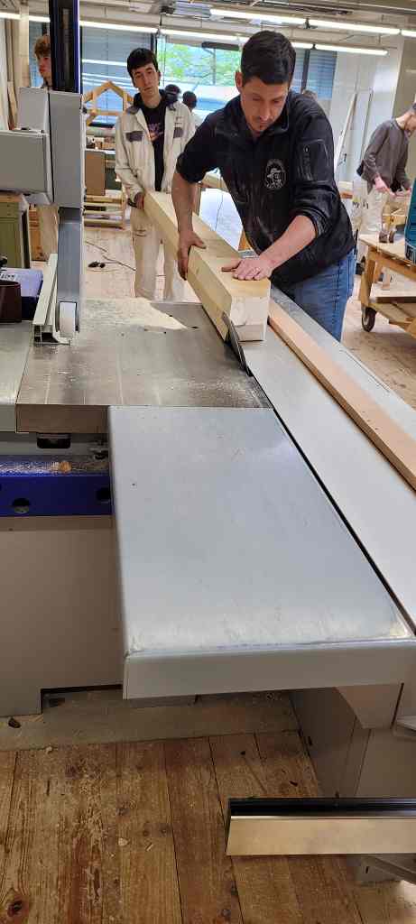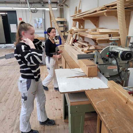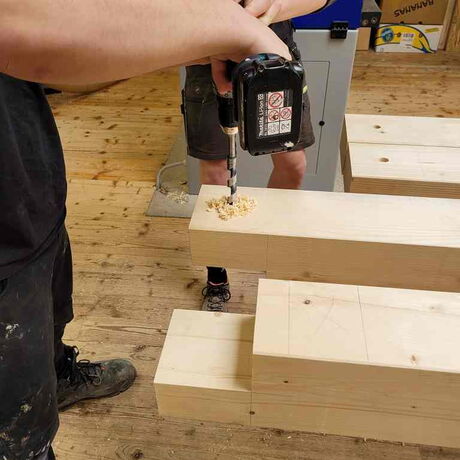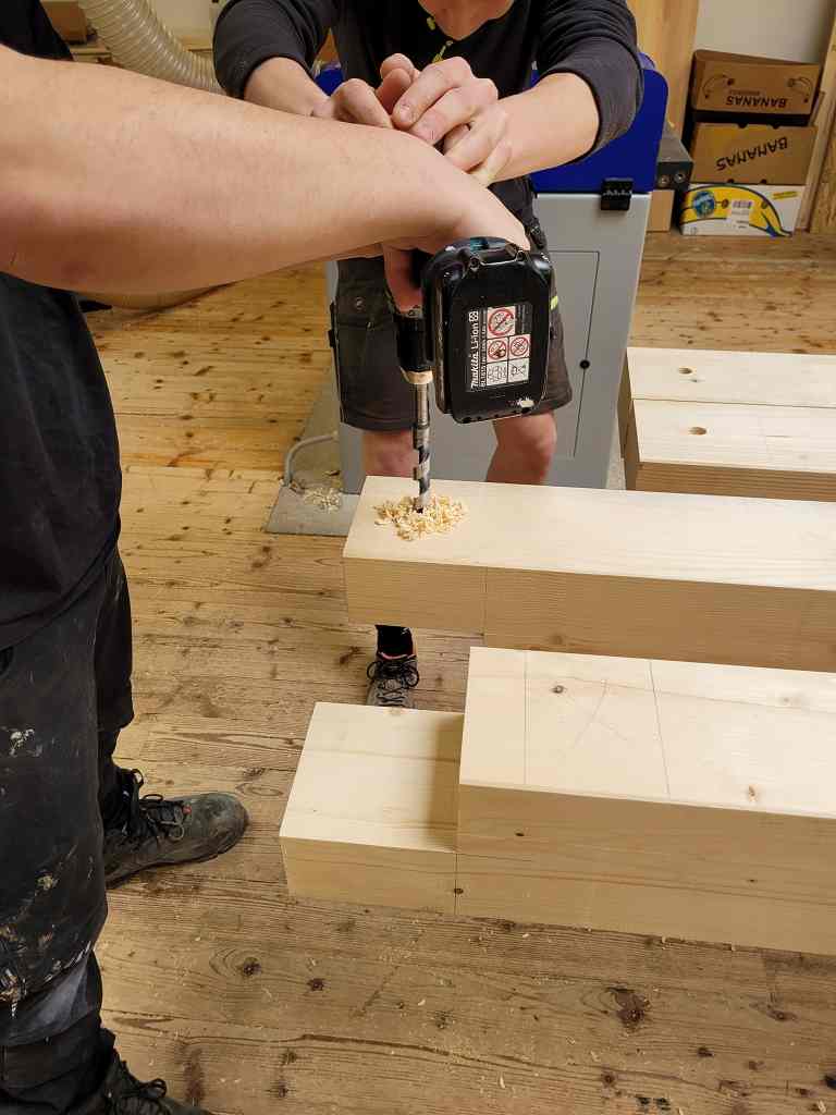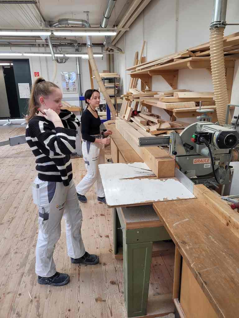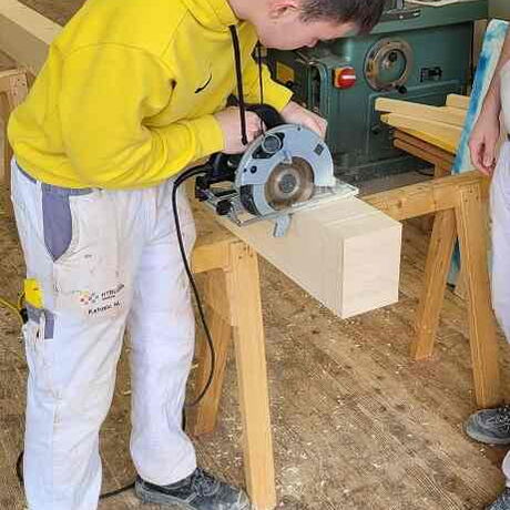 Die Schülerinnen und Schüler lernten, die Maße (SEMA Abbundpläne) auf die Konstruktionshölzer zu übertragen, mit dem Alphawinkel anzureißen und unter sicherheitstechnischen Maßnahmen mit den stationären und den Handholzbearbeitungsmaschinen abzubinden.