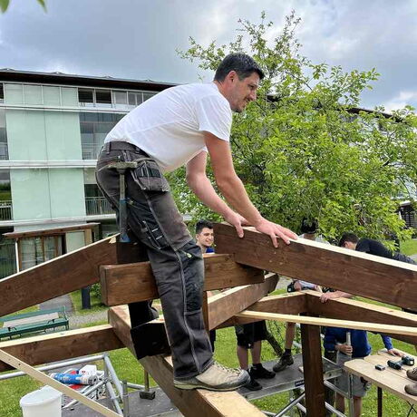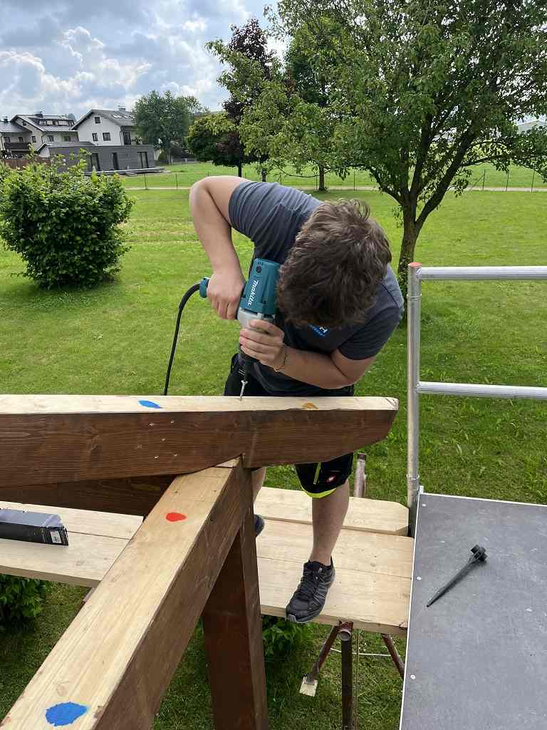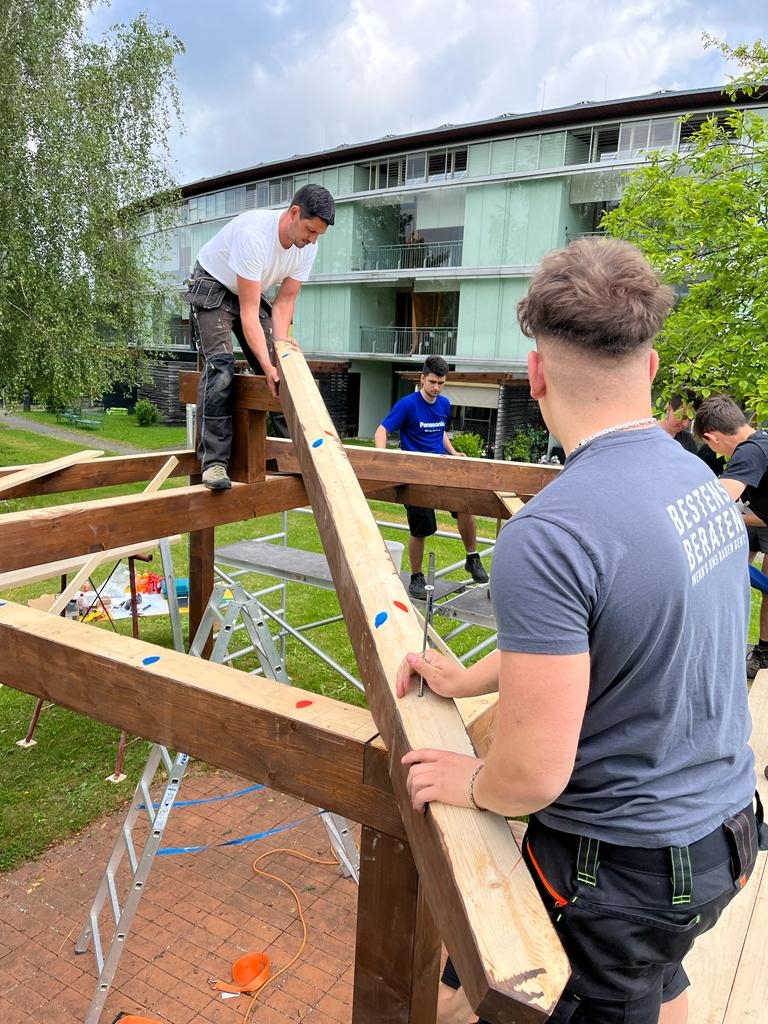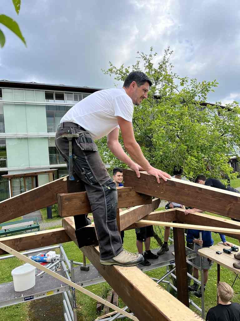 Mit viel Engagement und Begeisterung wurde der Gartenpavillon auf der Baustelle im Seniorenheim Straßwalchen von den Schülerinnen und Schülern mit Unterstützung durch den Fachlehrer montiert. Dabei konnte man sehr gut beobachten, mit welcher Freude die Schülerinnen und Schüler ans Werk gingen und ihr Projekt fertigstellten.