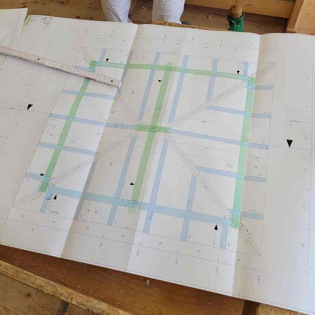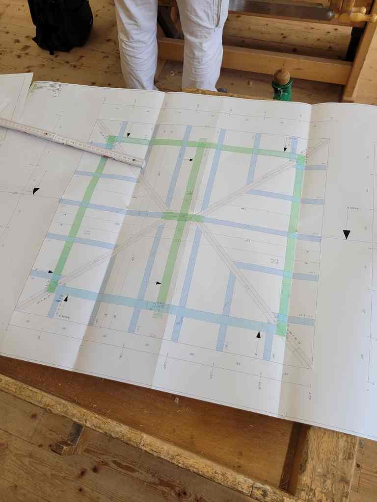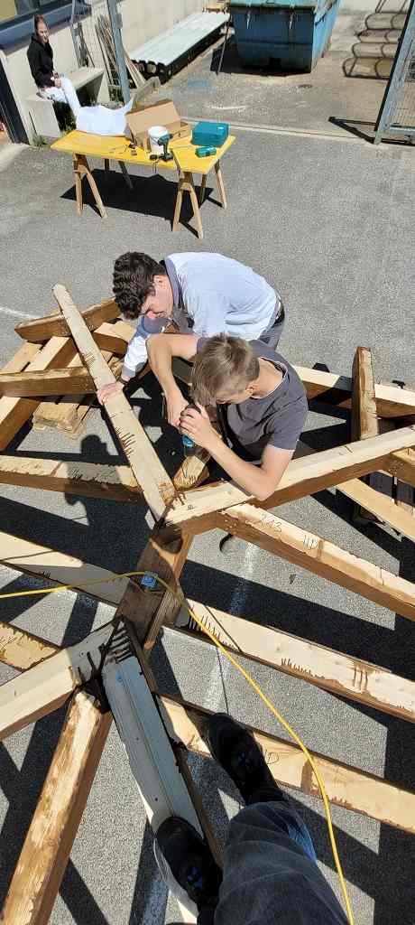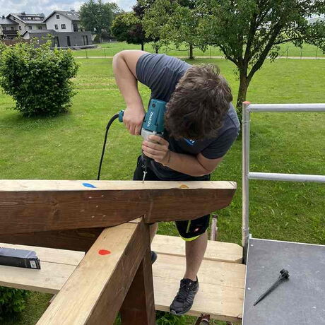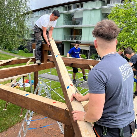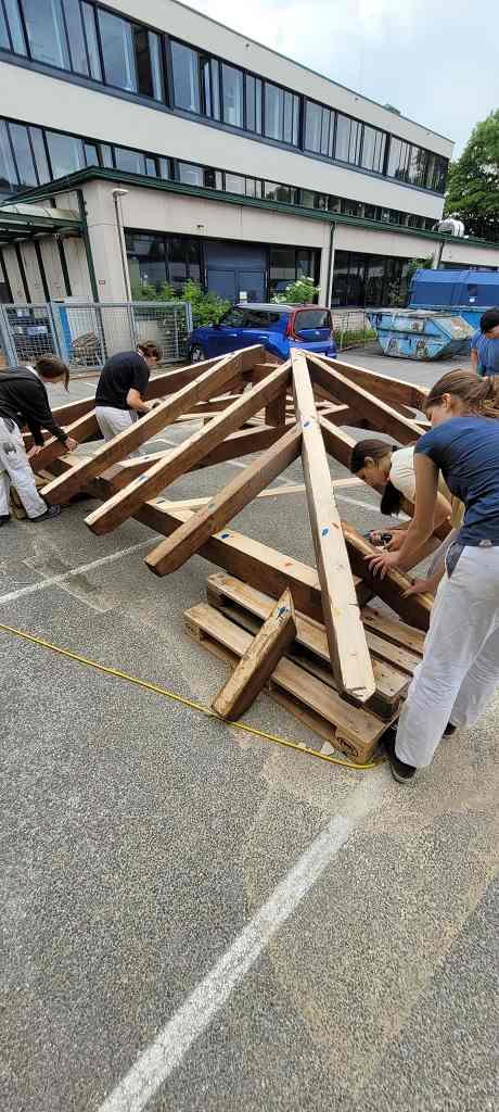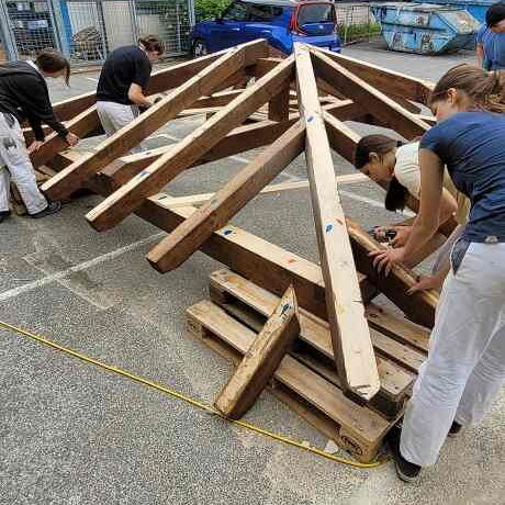 Nachdem die Konstruktionshölzer von den Schülerinnen und Schülern zwei Mal mit einer Holzschutzlasur gestrichen worden waren, wurde die Dachkonstruktion im Bereich Produktionstechnik und Baupraxis der Abteilung Bautechnik vorab zusammengebaut.