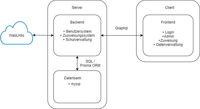 Das Projekt umfasst eine serverseitig gerenderte Web-App, die sich auch als Mobile-App auf Mobilgeräten installieren lässt, mit einem Node.js Backend, das die Brücke zur Datenbank bildet, die alle notwendigen Daten zur Nachhilfepartnerfindung speichert. Die Datenbank und die Webanwendung können von einem Provider oder lokal in einem Software-Container gehostet werden. Über eine GraphQL API werden von der Datenbank jene Daten geschickt oder empfangen, die auf der Website erzeugt bzw. angefragt werden. Der Nutzer hat die Möglichkeit nach Nachhilfe zu suchen oder diese anzubieten