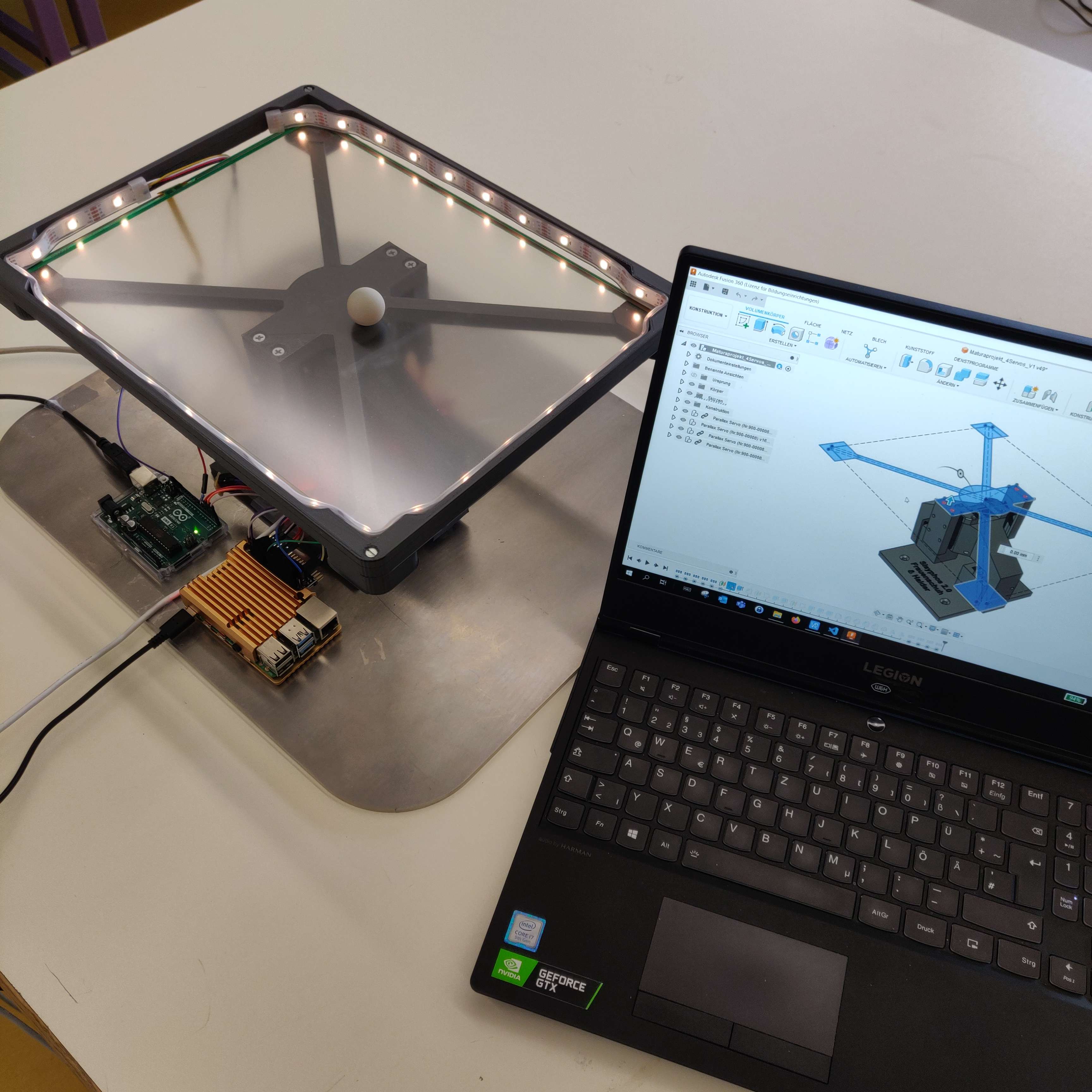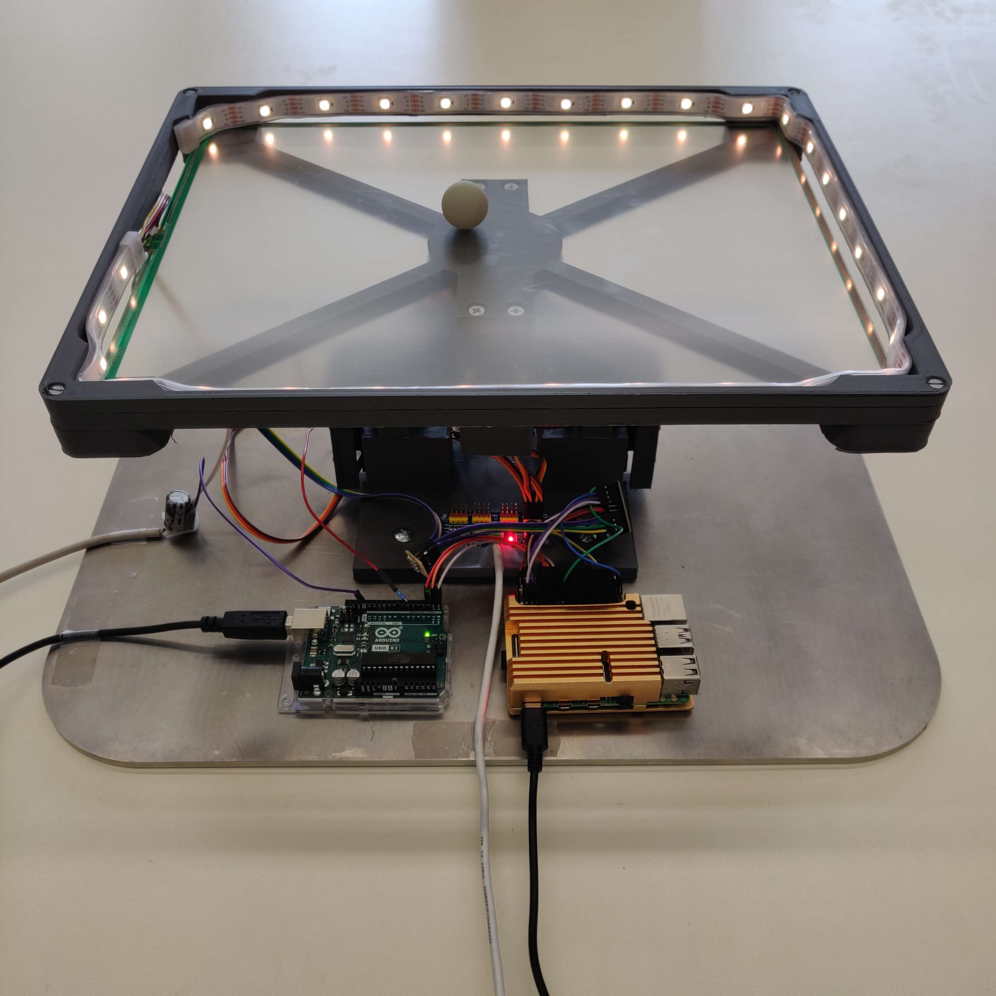 Das mechanische Grundgerüst bildet ein von Grund auf selbst konstruiertes 2-Achsen-Gimbal, das von 4 über einen Servotreiber versorgten Servomotoren bewegt wird. Die Erfassung der Kugelposition erfolgt über ein druckempfindliches Touchpanel. Diese Daten werden anschließend verarbeitet (Regler) und als Stellgröße an den Servotreiber übergeben.