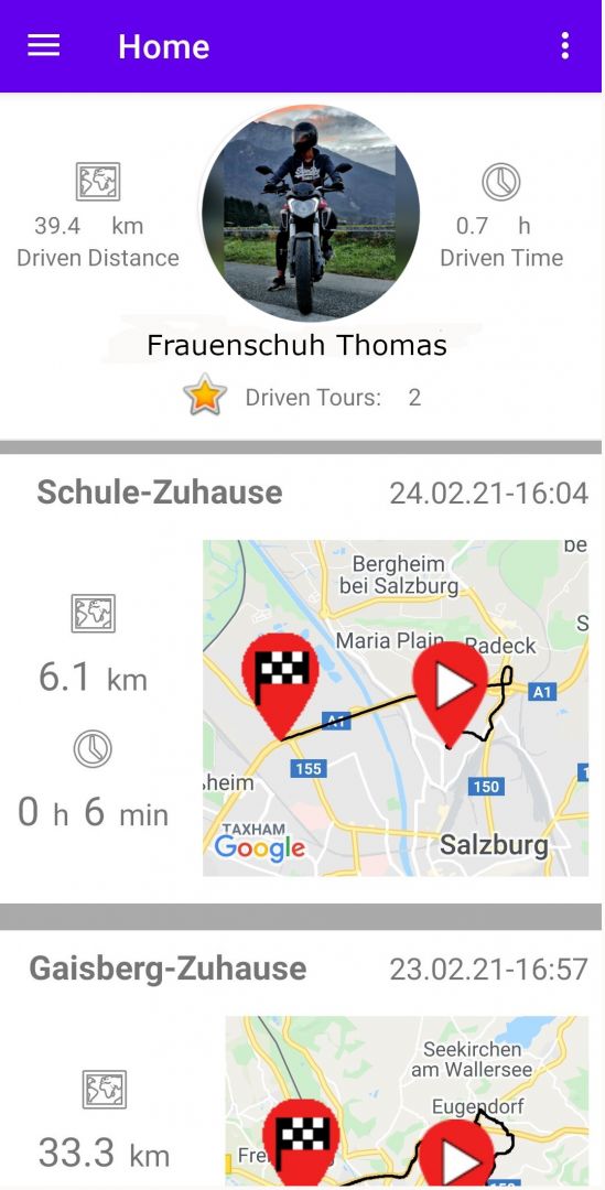 Für eine Fahrdatenauswertung können dieselben Sensordaten herangezogen werden. Um Einsicht auf diese Daten zu bekommen, wurde eine mobile App entwickelt, in welcher man sich den Streckenverlauf, Schräglage, Beschleunigung und Geschwindigkeit einer Motorradfahrt auf einer interaktiven Karte anzeigen lassen kann.
