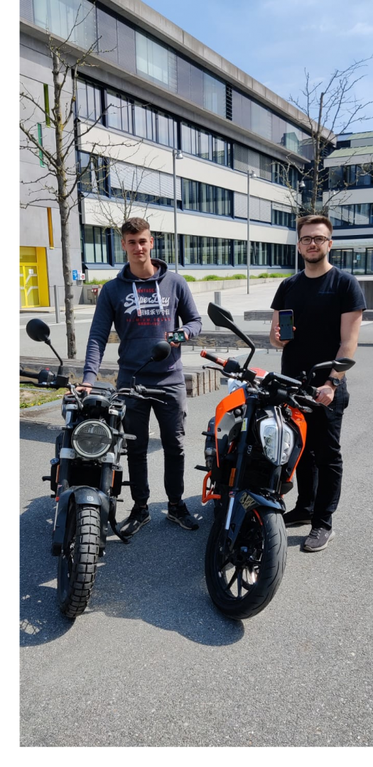 Um Motorradfahrern und Motorradfahrerinnen nach einem Sturz ein Gefühl von Sicherheit zu gewähren und nach jeder Fahrt den Einblick in interessante Fahrdaten zu ermöglichen, wurde eine Motorradsturzerkennung mit Fahrdatenauswertung entwickelt.