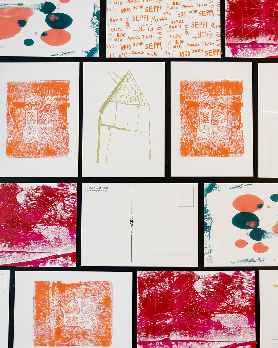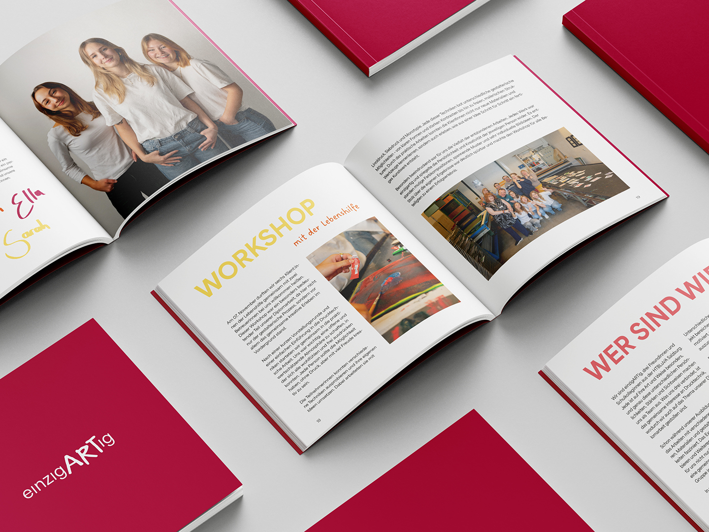 Zur Umsetzung führten wir einen Druckworkshop in Zusammenarbeit mit der Lebenshilfe Hallein durch. Dort gestalteten die Teilnehmer:innen eigene Werke, die den Kern des Projekts bilden. Die Ergebnisse wurden in einem Kunstbuch dokumentiert, das sowohl den kreativen Prozess als auch die fertigen Arbeiten präsentiert. Miriam Krutter übernahm das Corporate Design und die Fotografie, Sarah Wimmer das Editorial Design und Merchandise, und Elena Wohlstreicher die Social-Media-Strategie sowie die begleitende Printkampagne.