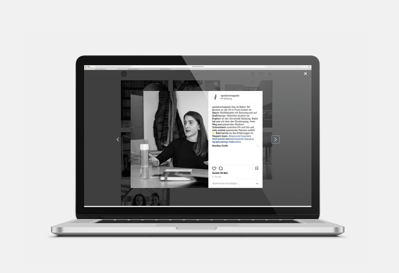 Oft ist angehenden GrafikerInnen unklar was sie später im Studium oder im Berufsleben erwartet. Mit dem Magazin Upstairs wollen wir ihnen einen Ausblick und Leitfaden für die Arbeitswelt in der Branche geben. Außerdem werden darin Möglichkeiten bezüglich Aus- und Weiterbildung aufgezeigt und praxisorientierte Tipps gegeben. Aus 18 Interviews mit StudentInnen, GrafikerInnen und FreelancerInnen, aus 7 Städten in ganz Österreich haben wir die spannendsten Informationen herausgefiltert und in einem Magazin mit ausgefeiltem grafischen Konzept aufbereitet. Teil des Projekts war neben der Recherche und dem Corporate- und Editorialdesign auch die Vermarktung des Magazins auf Social Media und mittels Print Werbemittel.