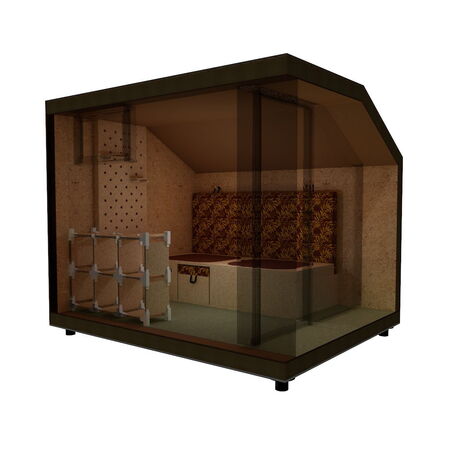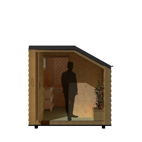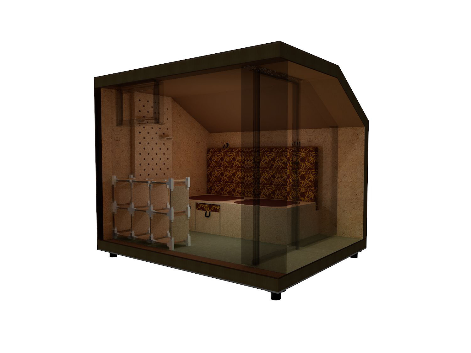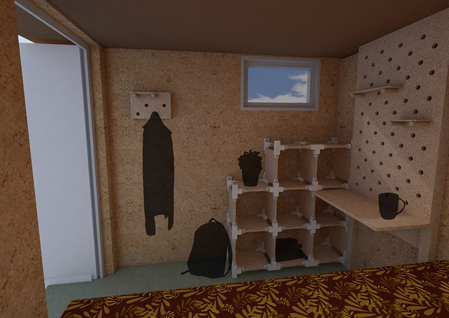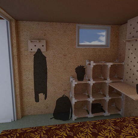 Gabriela Pranjic war für die Konstruktion der Außenhülle zuständig. Diese Aufgabe beinhaltete die Planung des Wandaufbaues, der Fassade und die Planung weiterer bautechnischen Komponenten, die für eine funktionierende Konstruktion wichtig waren. Weiteres Aufgabengebiet war die Entwicklung einer optionalen Begründung, welche am Modul angebracht werden kann. Laura Mudra arbeitete an der Kon-zeptionierung des Innenbereichs. Für diesen designte die funktionelle und platzsparende Möbel, die ausreichend Stauram beherbergen. Hierfür entwickelte sie neben dem Farbkonzept auch ein Muster für einen Stoff, welcher im Schlafbereich zum Einsatz kommt und beschäftigte sich mit weiterer Ausstattung die für den Alltag gebraucht wurde.