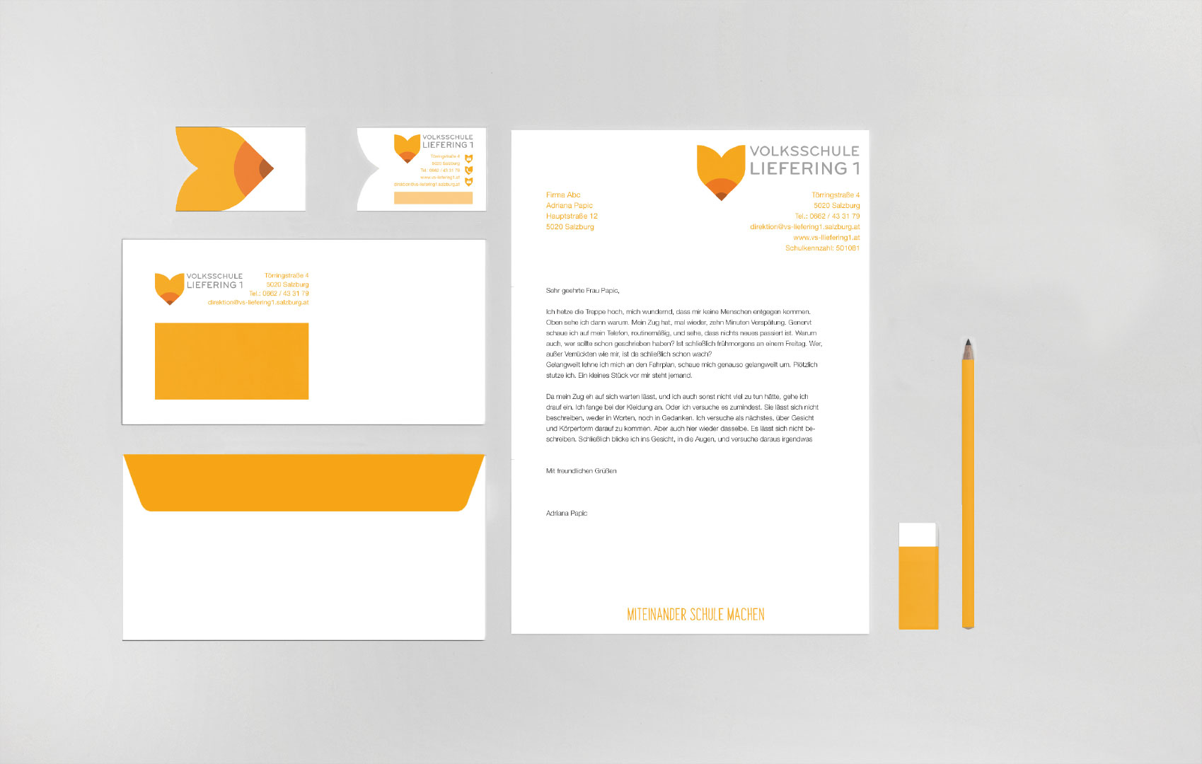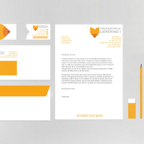 Der Schwerpunkt lag beim Entwurf eines innovativen und zeitlosen Logos, wie auch der Gestaltung der gesamten Geschäftsausstattung und diverser Printprodukte, wie Flyer, Plakat und Infobroschüre. Ziel des Projektes ist es, alle Komponenten zu einem stimmigen und kinderfreundlichen Erscheinungsbild zu verbinden. Weiteres soll die Volksschule Liefering 1 einen hohen Wiedererkennungswert erlangen.