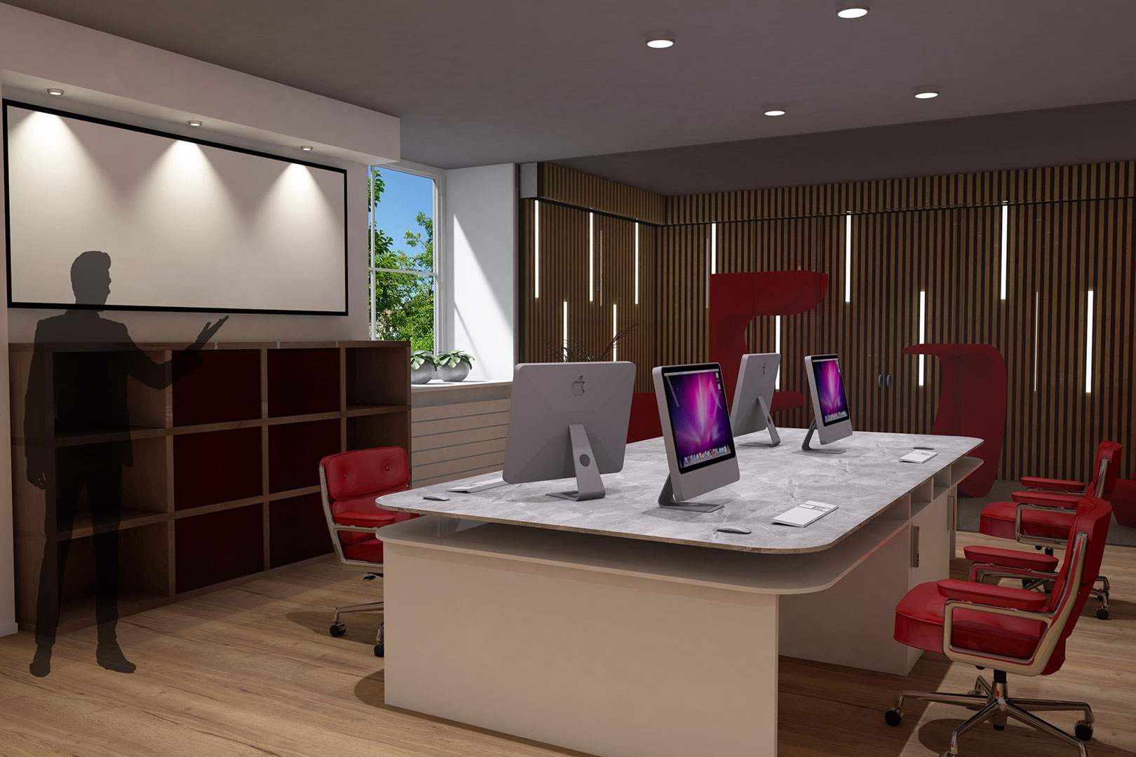 Das Corporate Design, sowie die Philosophie der Agentur wurde für das Projekt übernommen, um ein einheitliches Konzept zu bewahren. Planvorlage war der Grundriss von Wagner+Partner Consulting GmbH aus dem Jahr 2010. Für unsere Diplomarbeit kreierten wir ein neues Gestaltungskonzept das eine verbesserte Möblierung, neue Raumstrukturen, sowie revidierte Material- und Farbkonzepte gewährleistete. Die Farbe Rot, die sich aus dem CI der Academy Bar ableitete, zog sich als unser Leitfaden durch das Projekt. Unsere selbst entwickelten Design Objekte wiederholten sich in unseren einzelnen, individuellen Bereichen um für ein stimmungsvolles und übergreifendes Gesamtbild zu sorgen.