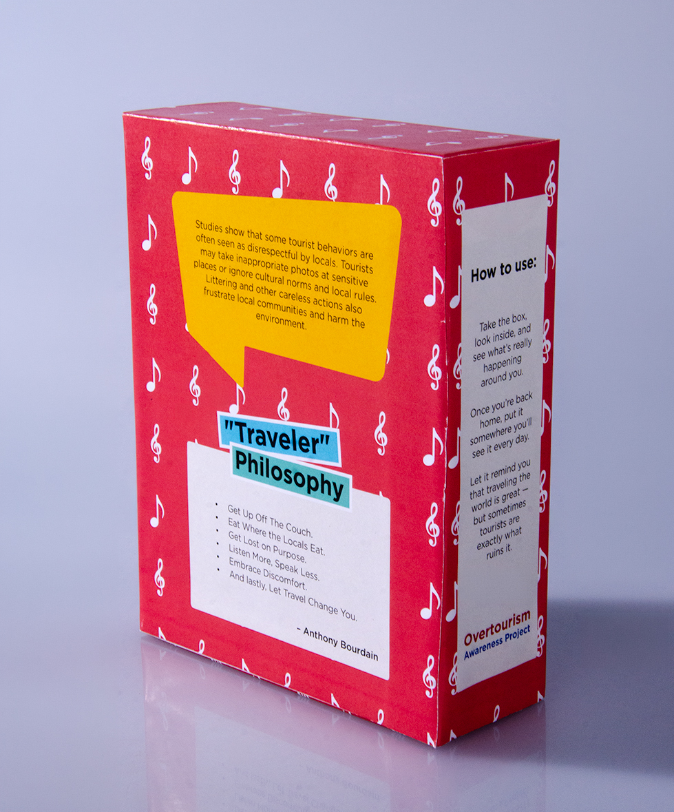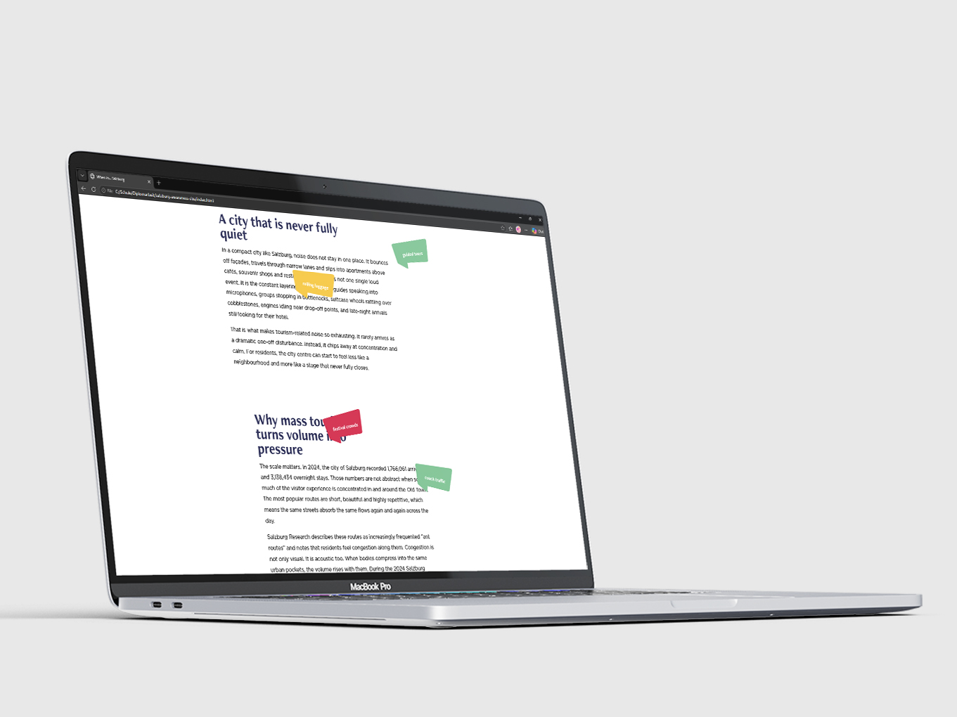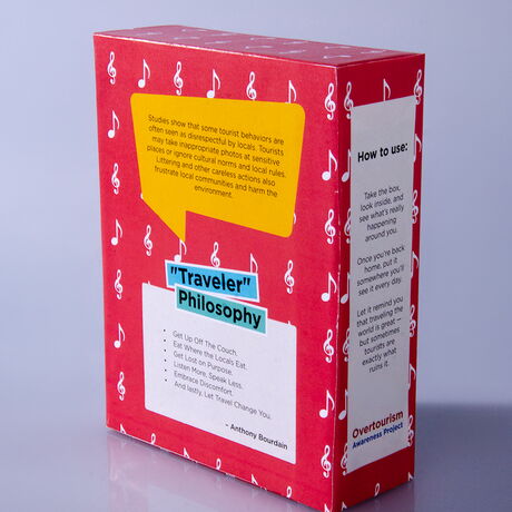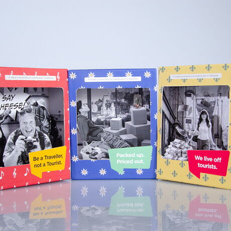 Im Rahmen des Projekts wurden eine Website, ein Instagram-Auftritt, ein Corporate Design sowie Postkarten und Verpackungsprototypen konzipiert und umgesetzt. Die Aufgaben des Teams umfassten Hintergrundrecherche, Konkurrenzanalyse und die Ausarbeitung der gestalterischen Grundlagen. Ergänzend dazu wurden die Verpackungen als zentrale visuelle Träger entwickelt und in eine einheitliche Kampagne eingebettet. Ziel der Arbeit ist es, Betroffene und Tourist:innen für die Auswirkungen des Massentourismus zu sensibilisieren und den Diskurs über nachhaltigen Tourismus in Salzburg anzuregen.
