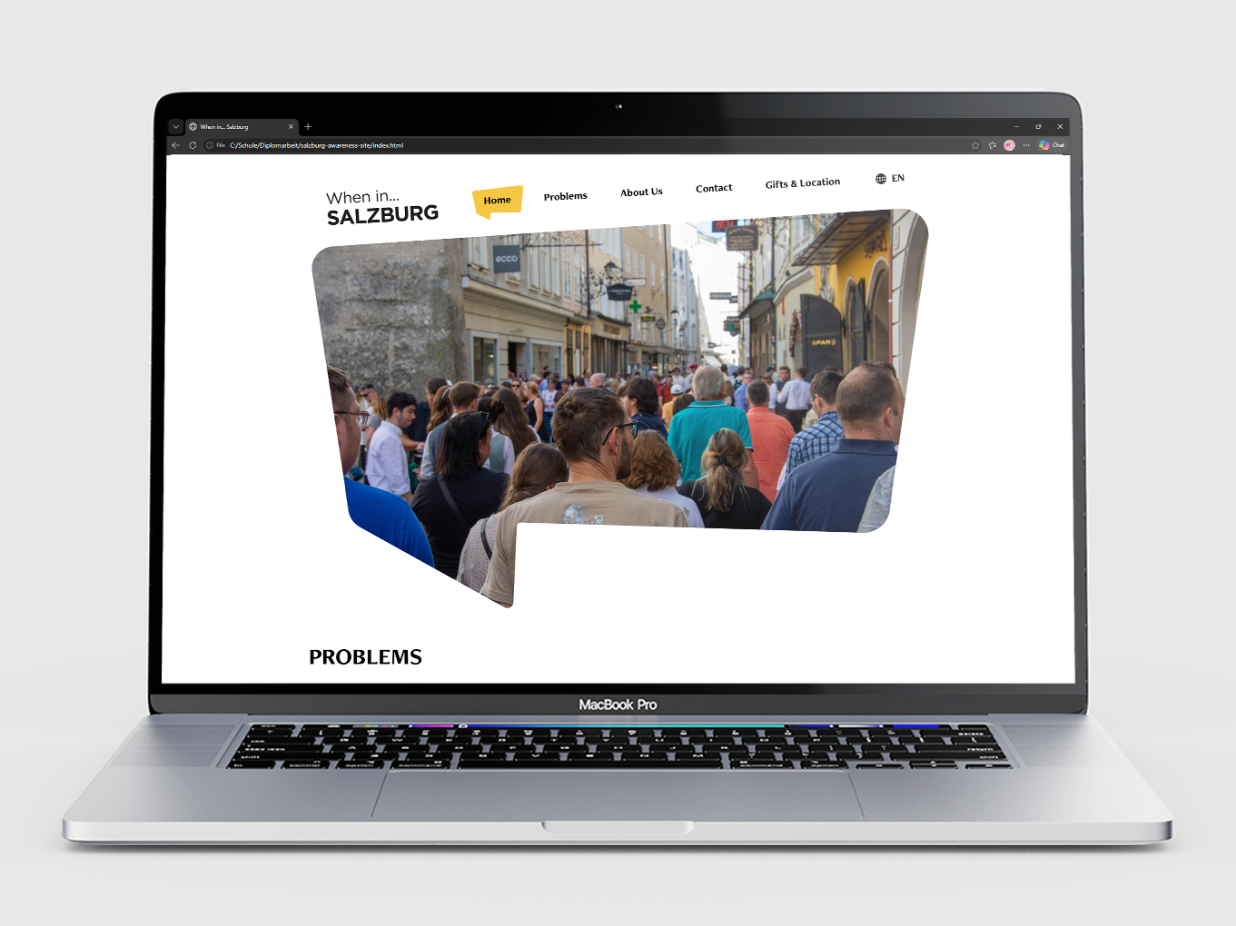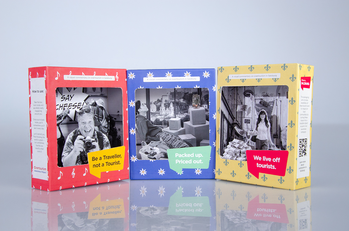 Die Diplomarbeit When in… Salzburg beschäftigt sich mit den Folgen des Massentourismus im Land Salzburg und mit der Frage, wie diese Problematik für eine breites Publikum sichtbar gemacht werden kann. Der Massentourismus belastet Wohnraum, Umwelt und Lebensqualität der Bevölkerung zunehmend, weshalb das Projekt eine Awareness-Kampagne entwickelte, die auf diese Missstände aufmerksam macht. Im Zentrum steht die gestalterische Übersetzung abstrakter gesellschaftlicher Probleme in konkrete, greifbare Objekte in Form von Verpackungen.