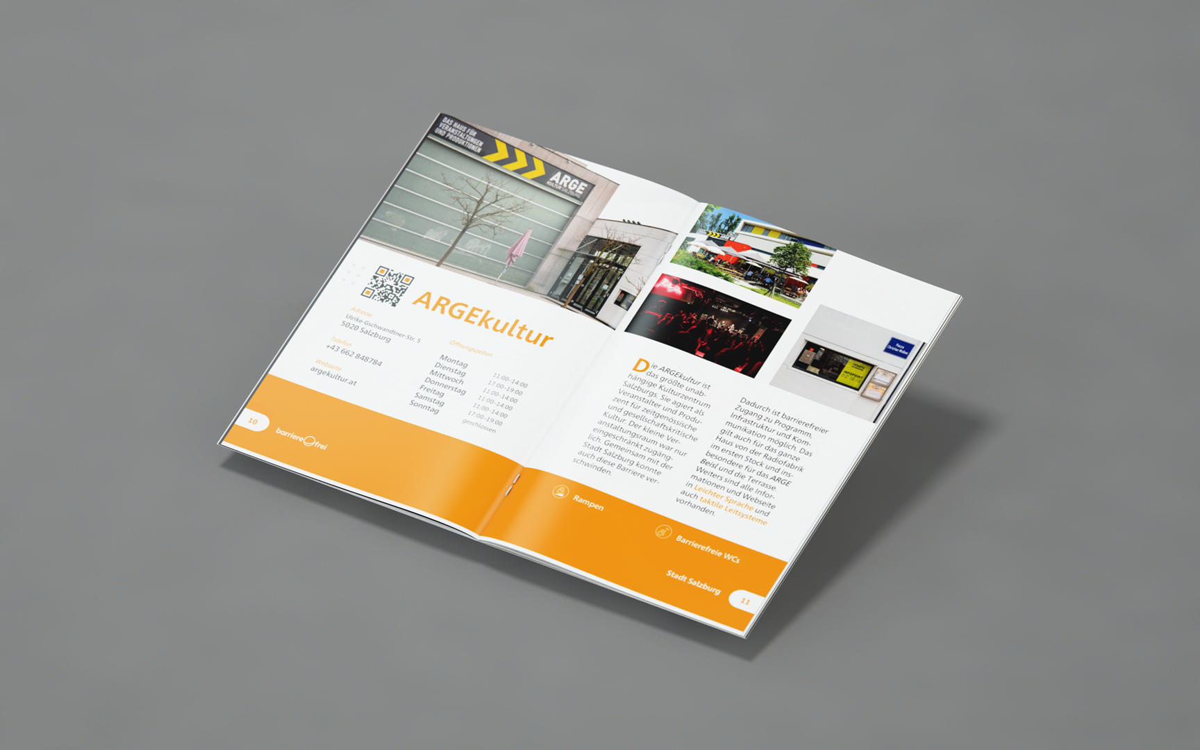 Anna Duong entwickelte diverse Printprodukte, darunter Flyer und vier Plakate, welche auch zu Transparenten abgeleitet wurden. Weiterst investierte sie Ihre Zeit in die Gestaltung eines Buchs, welches Informationen zur Barrierefreiheit in Salzburg bietet, dabei wurden verschiede- ne barrierefreie Orte der Stadt ausgearbeitet.