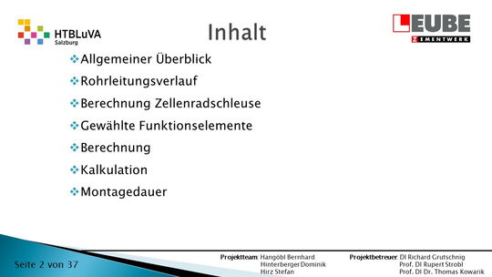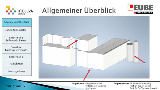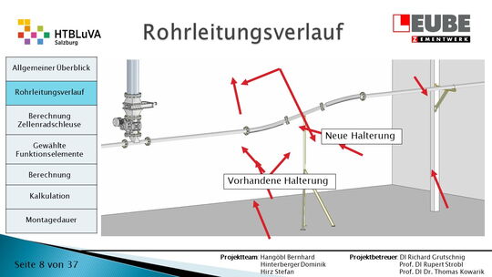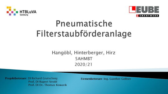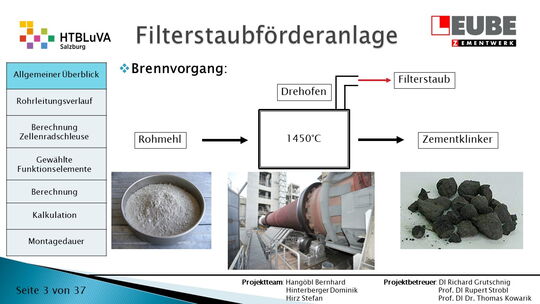 Die Firma Leube stellt Baustoffe, wie Zement, Kalk und Sand her. Bei der Zementproduktion fällt im Drehofen überflüssiger Staub an, der in drei Silos aufgeteilt und anschließend wieder in die Produktion eingebunden wird. Dieser Weg muss mithilfe einer pneumatischen Förderanlage überwunden werden. Dabei soll besonders auf die Wirtschaftlichkeit und Effektivität der Anlage geachtet werden.