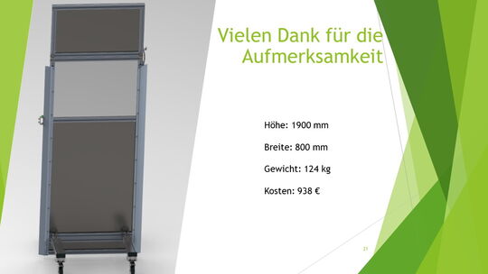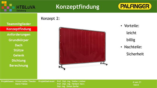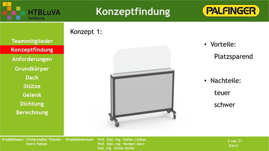 Den Anforderungen entsprechend wurden verschiedene Konzepte erstellt, von denen ein passendes Konzept ausgewählt wurde. Dieses wurde verfeinert und anschließend die Konstruktion und Berechnung der mobilen Sicherheitstrennwand begonnen.