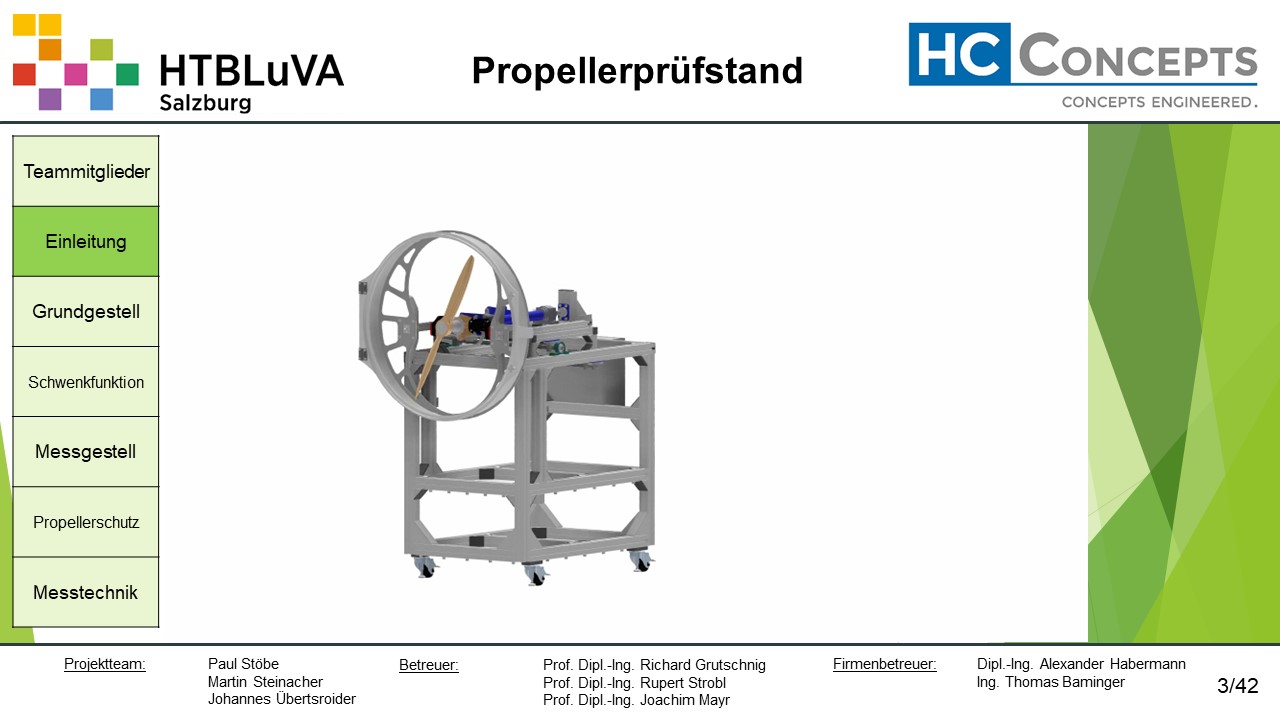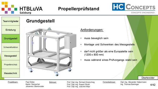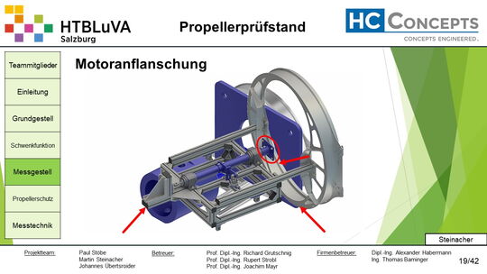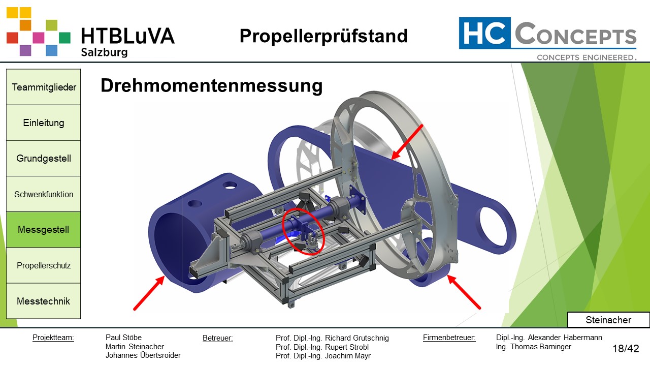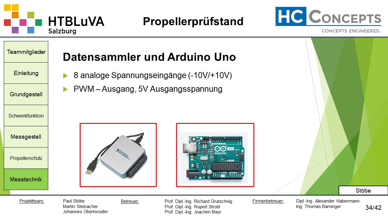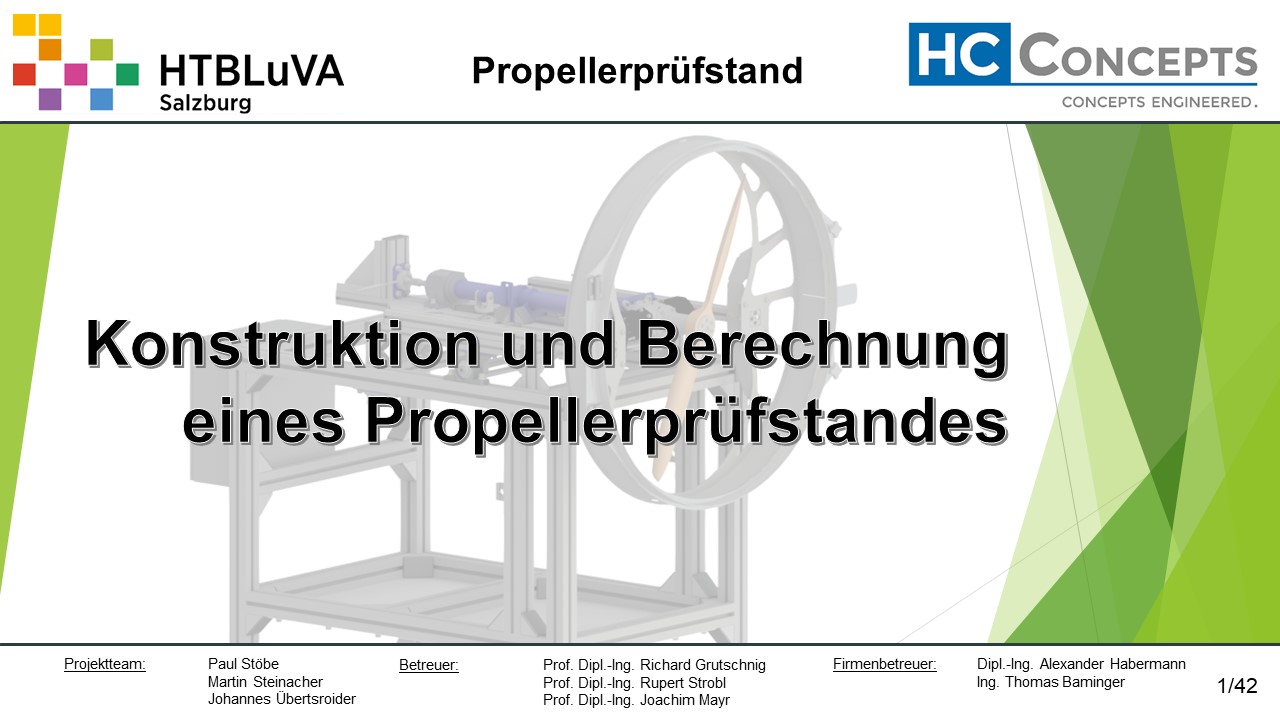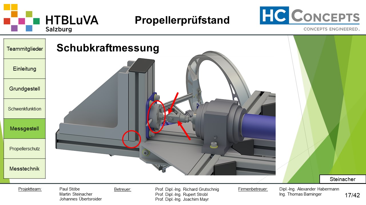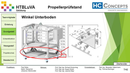 Die Firma HC-Concepts entwickelt unter anderem einen Verbrennungsmotor für Drohnen und für größere Modellflugzeuge. Hierfür wird ein Prüfstand benötigt, auf dem der Motor mit dem zugehörigen Propeller montiert und getestet werden kann. Der Prüfstand soll in der Lage sein, alle wichtigen Motordaten zu loggen und dabei die Schubkraft und das auftretende Kippmoment zu messen.