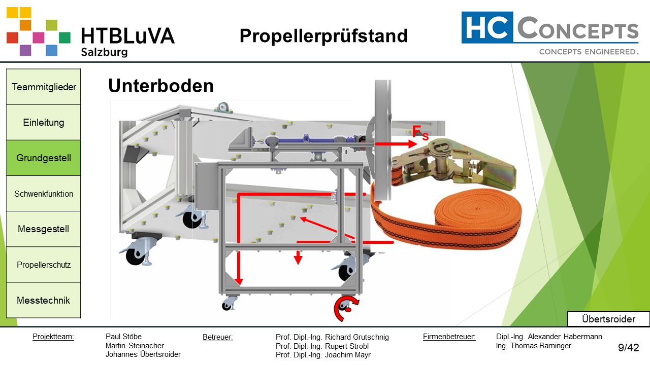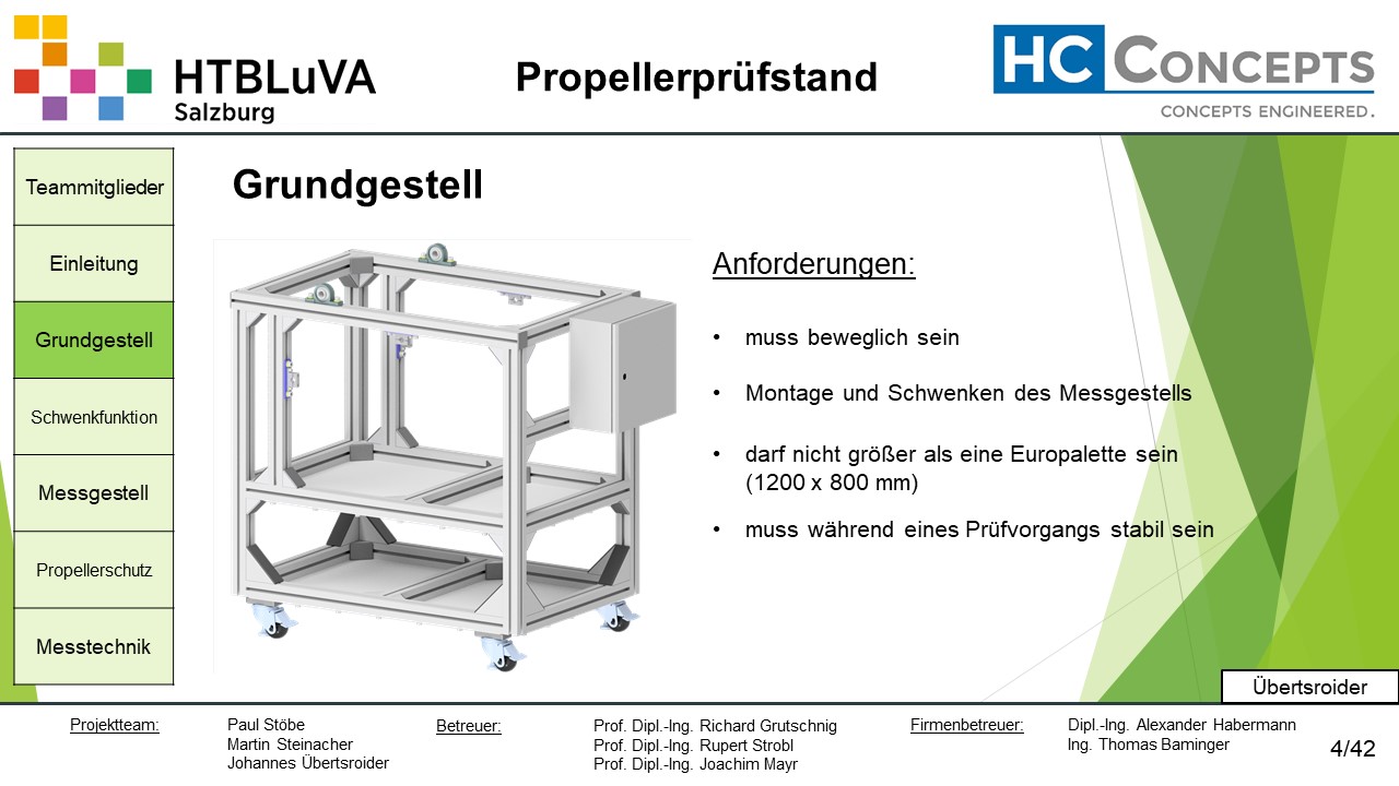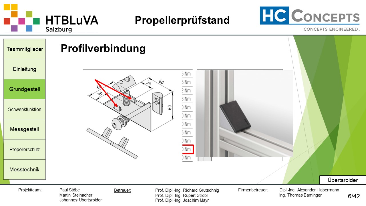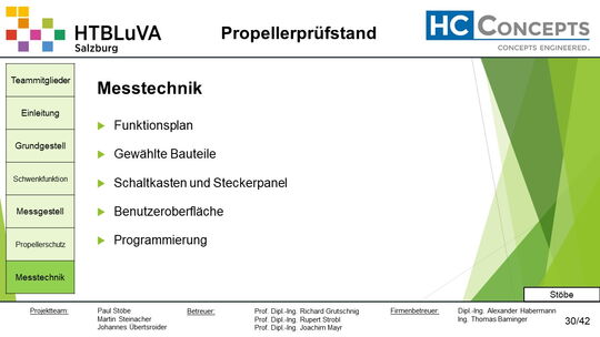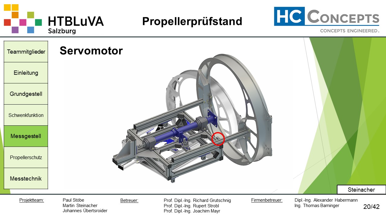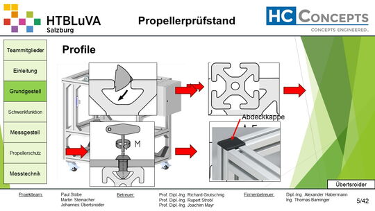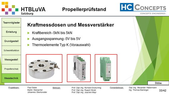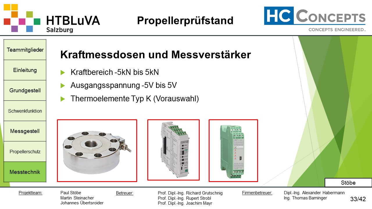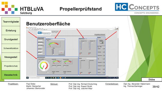 Die Firma HC-Concepts entwickelt unter anderem einen Verbrennungsmotor für Drohnen und für größere Modellflugzeuge. Hierfür wird ein Prüfstand benötigt, auf dem der Motor mit dem zugehörigen Propeller montiert und getestet werden kann. Der Prüfstand soll in der Lage sein, alle wichtigen Motordaten zu loggen und dabei die Schubkraft und das auftretende Kippmoment zu messen.