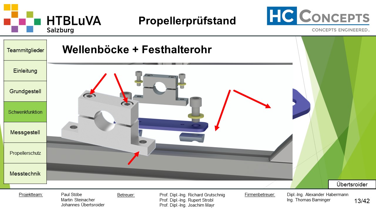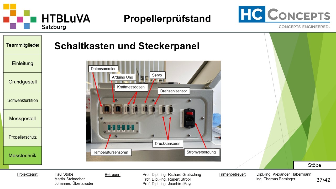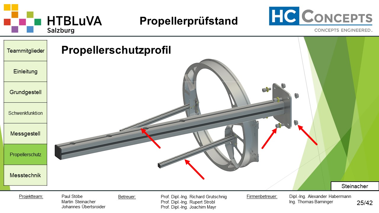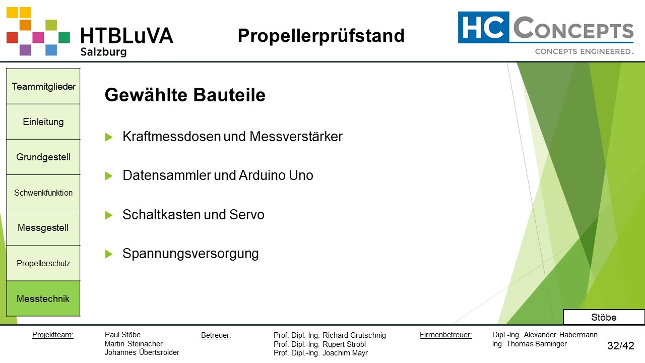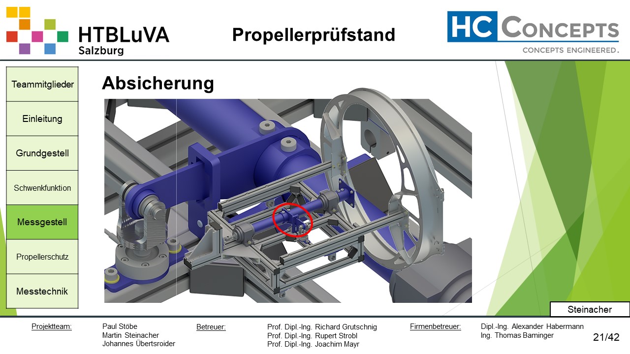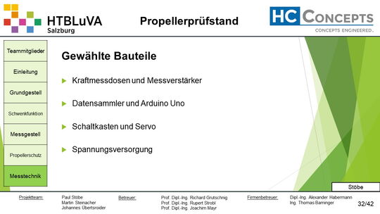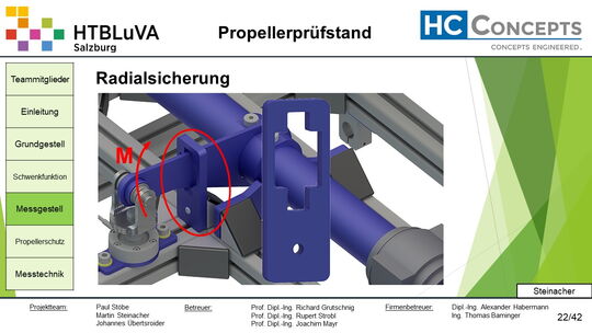 Die Firma HC-Concepts entwickelt unter anderem einen Verbrennungsmotor für Drohnen und für größere Modellflugzeuge. Hierfür wird ein Prüfstand benötigt, auf dem der Motor mit dem zugehörigen Propeller montiert und getestet werden kann. Der Prüfstand soll in der Lage sein, alle wichtigen Motordaten zu loggen und dabei die Schubkraft und das auftretende Kippmoment zu messen.