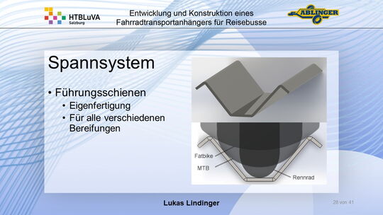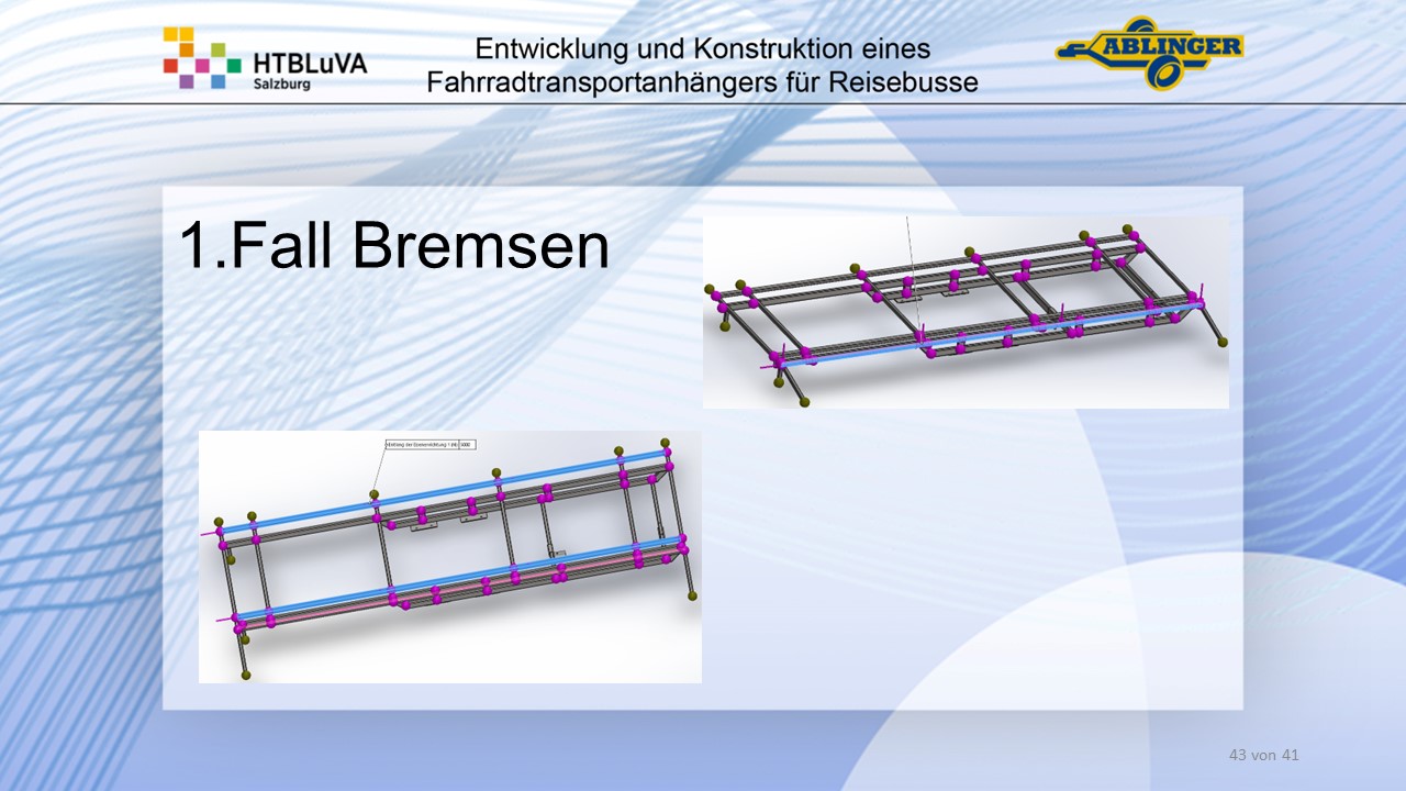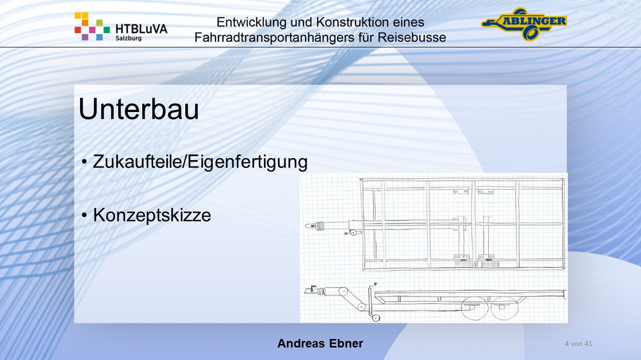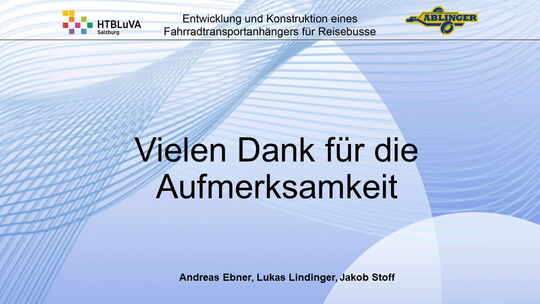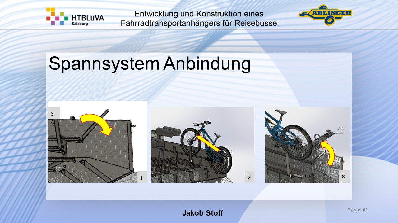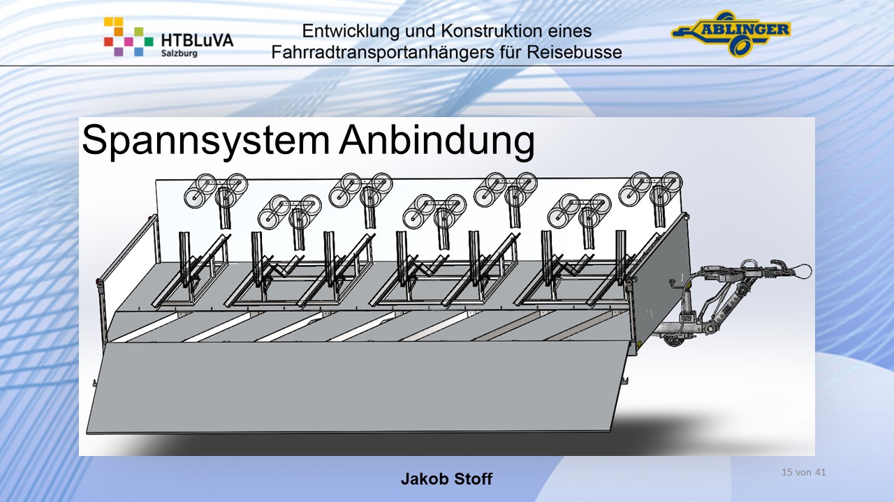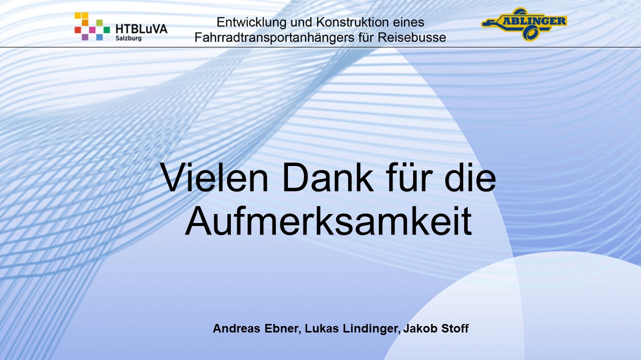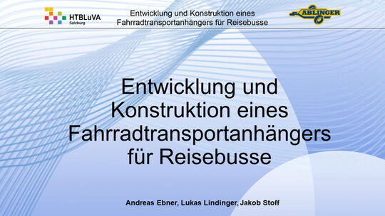 Für die Firma Ablinger Reinhold PKW-Anhänger und Fahrzeugbau GmbH, soll ein Fahrradtransportanhänger mit möglichst benutzerfreundlicher Be- und Entladung entwickelt werden. Bei bisherigen Anhängern ist es nur möglich, die Fahrräder der Reihe nach zu entladen. Bei unserem Anhänger muss die Einzelentnahme, mit minimalem körperlichen Aufwand für den Bediener, möglich sein. Ziel der Diplomarbeit ist ein vollständiges Konzept eines Fahrradtransportanhängers für Reisebusse, inklusive Konstruktion und Dimensionierung, unter Berücksichtigung wirtschaftlicher, fertigungstechnischer und sicherheitsrelevanter Einflüsse zu erstellen.