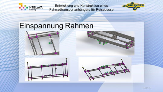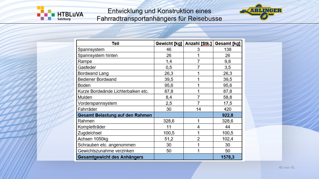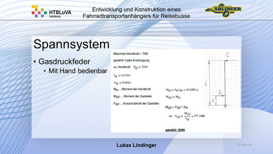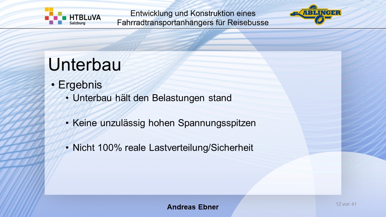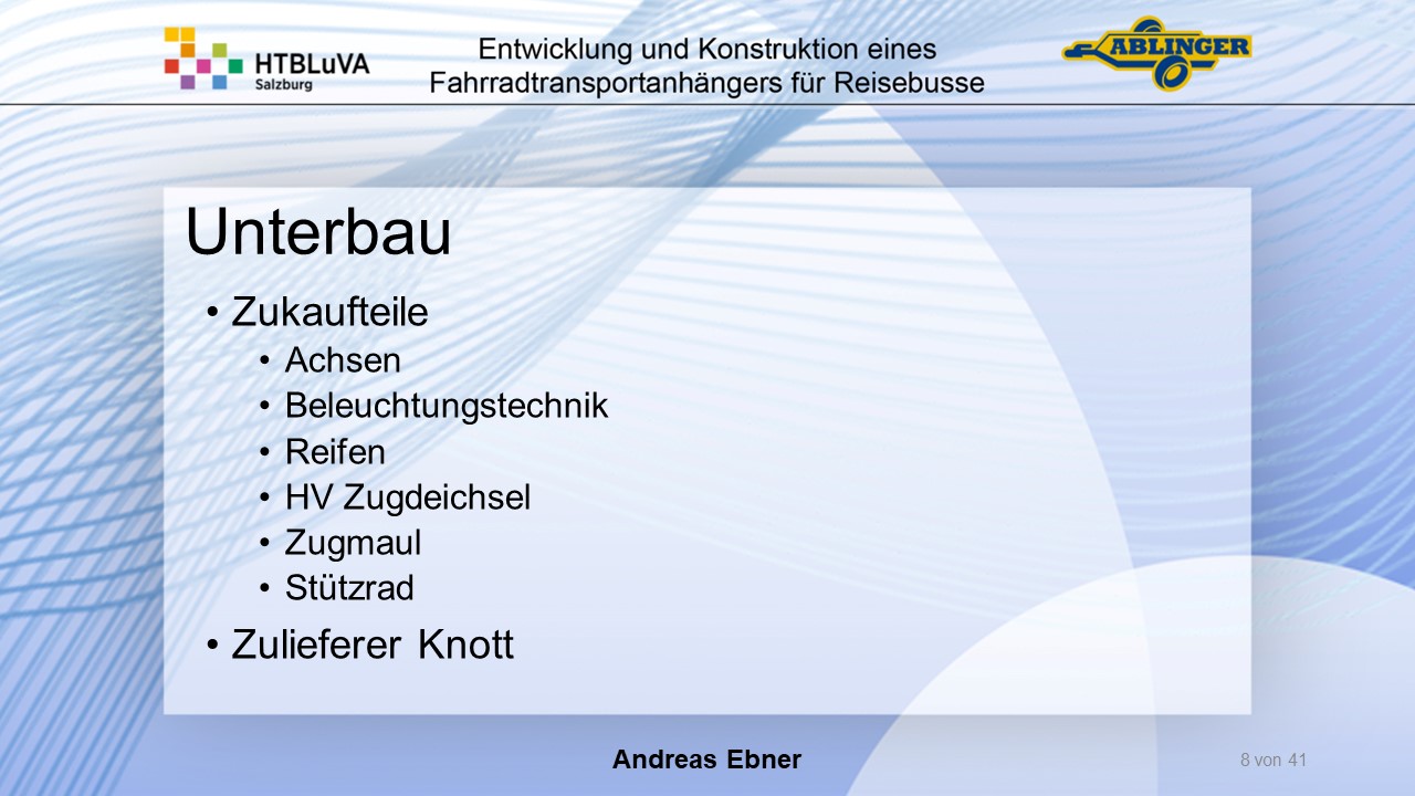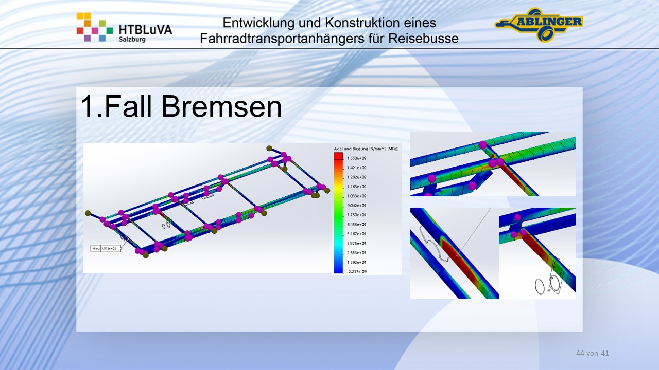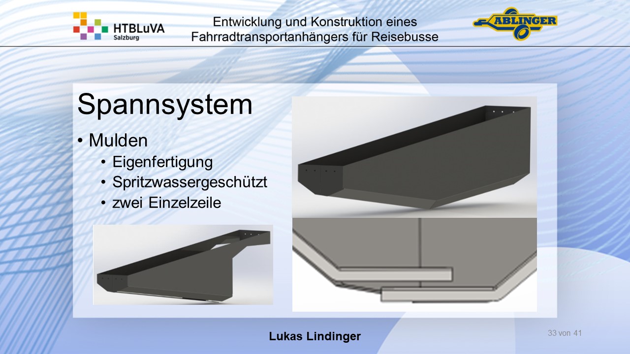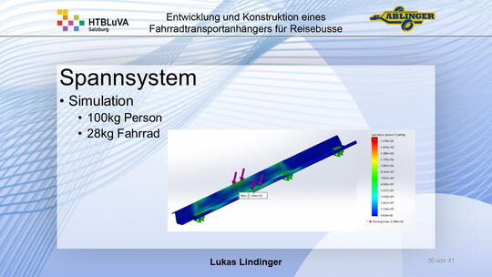 Für die Firma Ablinger Reinhold PKW-Anhänger und Fahrzeugbau GmbH, soll ein Fahrradtransportanhänger mit möglichst benutzerfreundlicher Be- und Entladung entwickelt werden. Bei bisherigen Anhängern ist es nur möglich, die Fahrräder der Reihe nach zu entladen. Bei unserem Anhänger muss die Einzelentnahme, mit minimalem körperlichen Aufwand für den Bediener, möglich sein. Ziel der Diplomarbeit ist ein vollständiges Konzept eines Fahrradtransportanhängers für Reisebusse, inklusive Konstruktion und Dimensionierung, unter Berücksichtigung wirtschaftlicher, fertigungstechnischer und sicherheitsrelevanter Einflüsse zu erstellen.