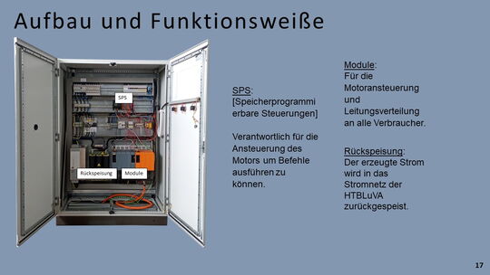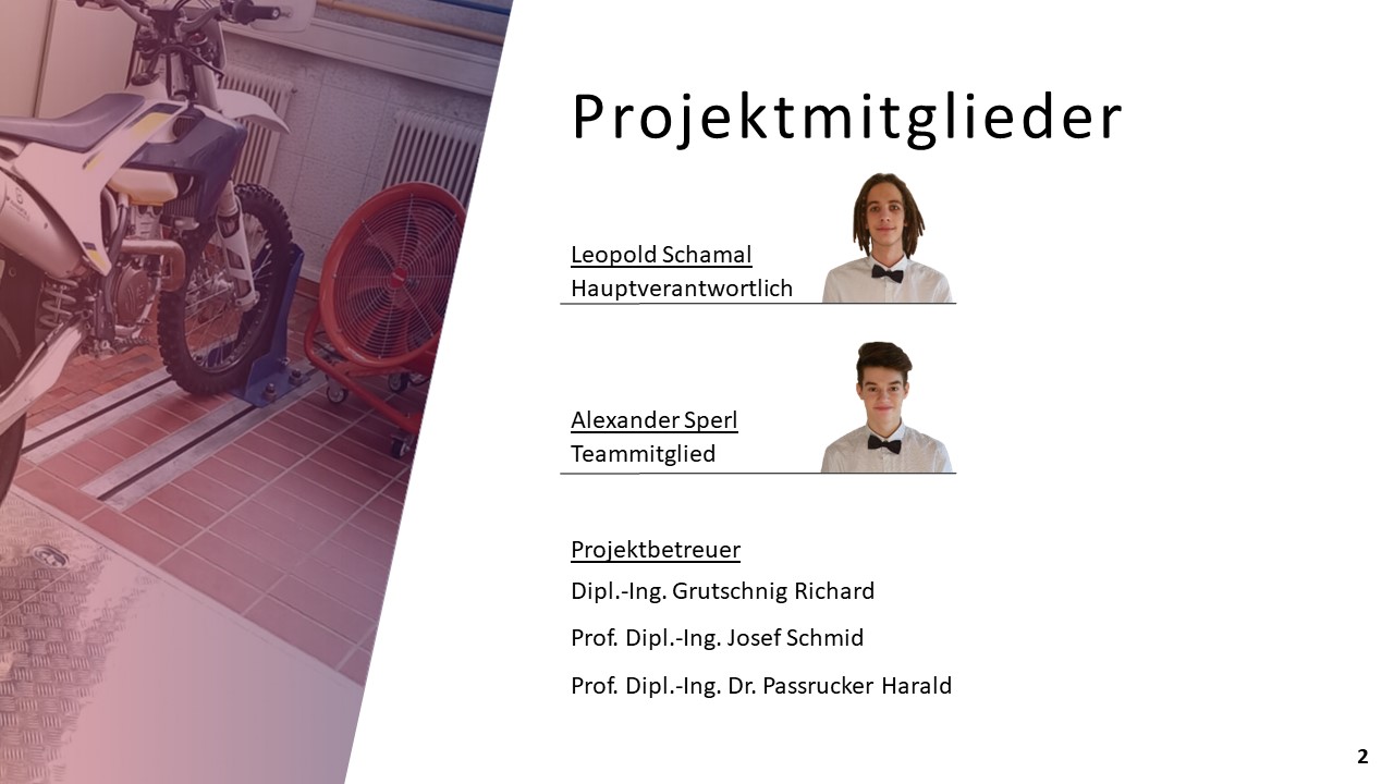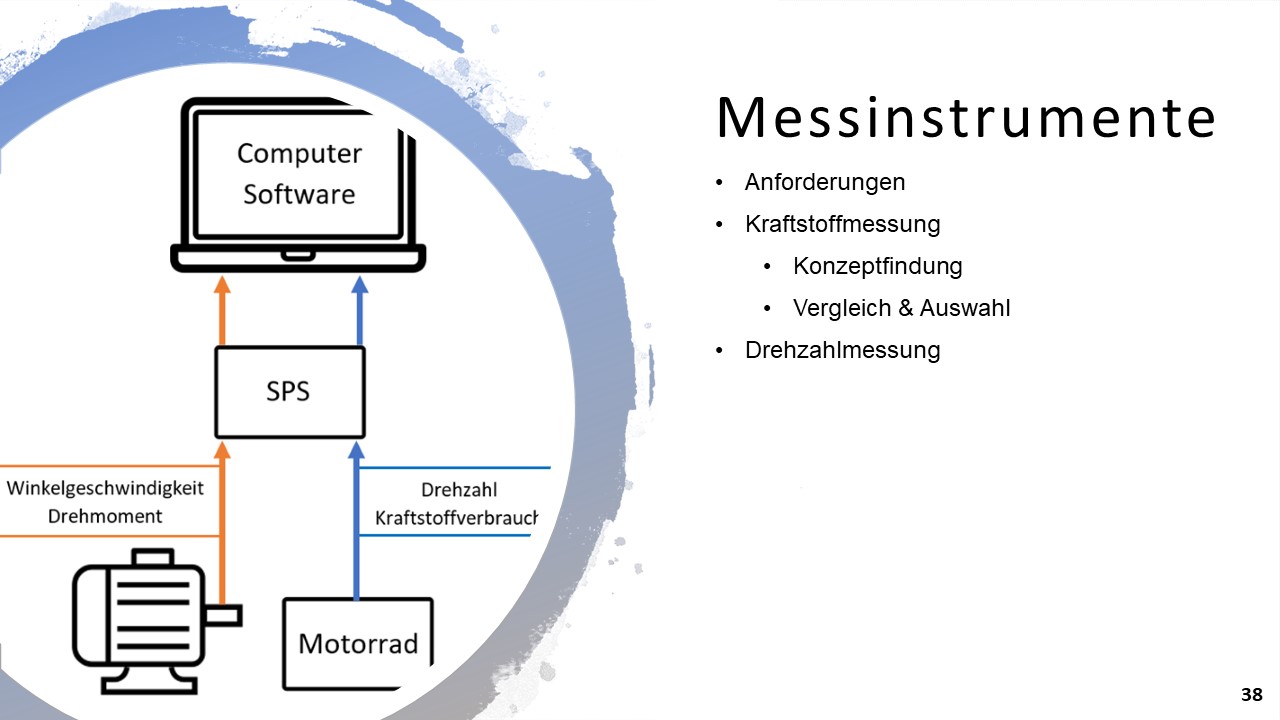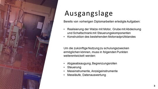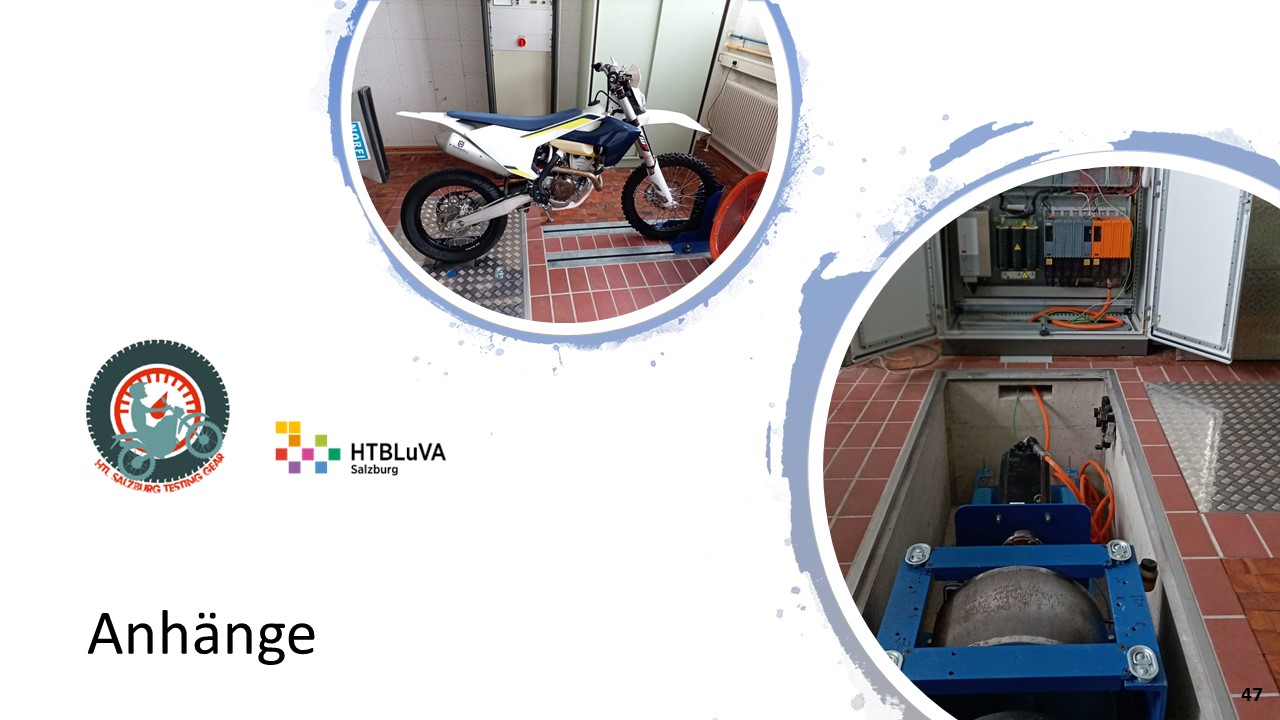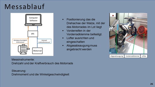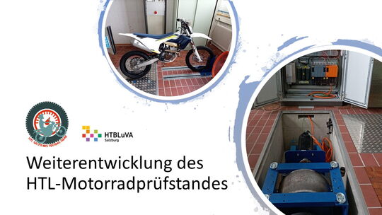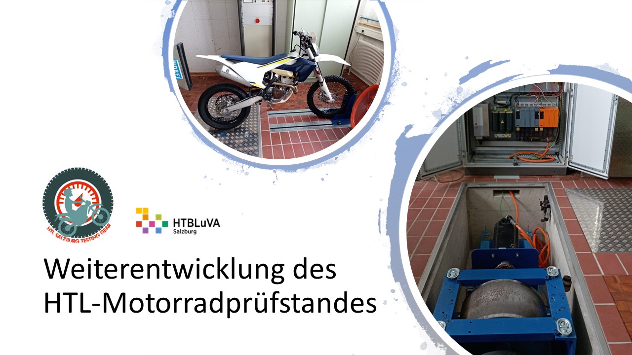 Ein, sich bereits in der HTBLuVA Salzburg befindender Motorradprüfstand, soll für die zukünftige Nutzung bei Laborübungen weiterentwickelt werden. Einerseits wurde sich zur Aufgabe gemacht, fehlende Komponenten des Rollenprüfstandes zu Entwickeln und Verwirklichen. Des Weiteren lag ein Augenmerk auf der Datenerfassung und Auswertung während Messläufen.