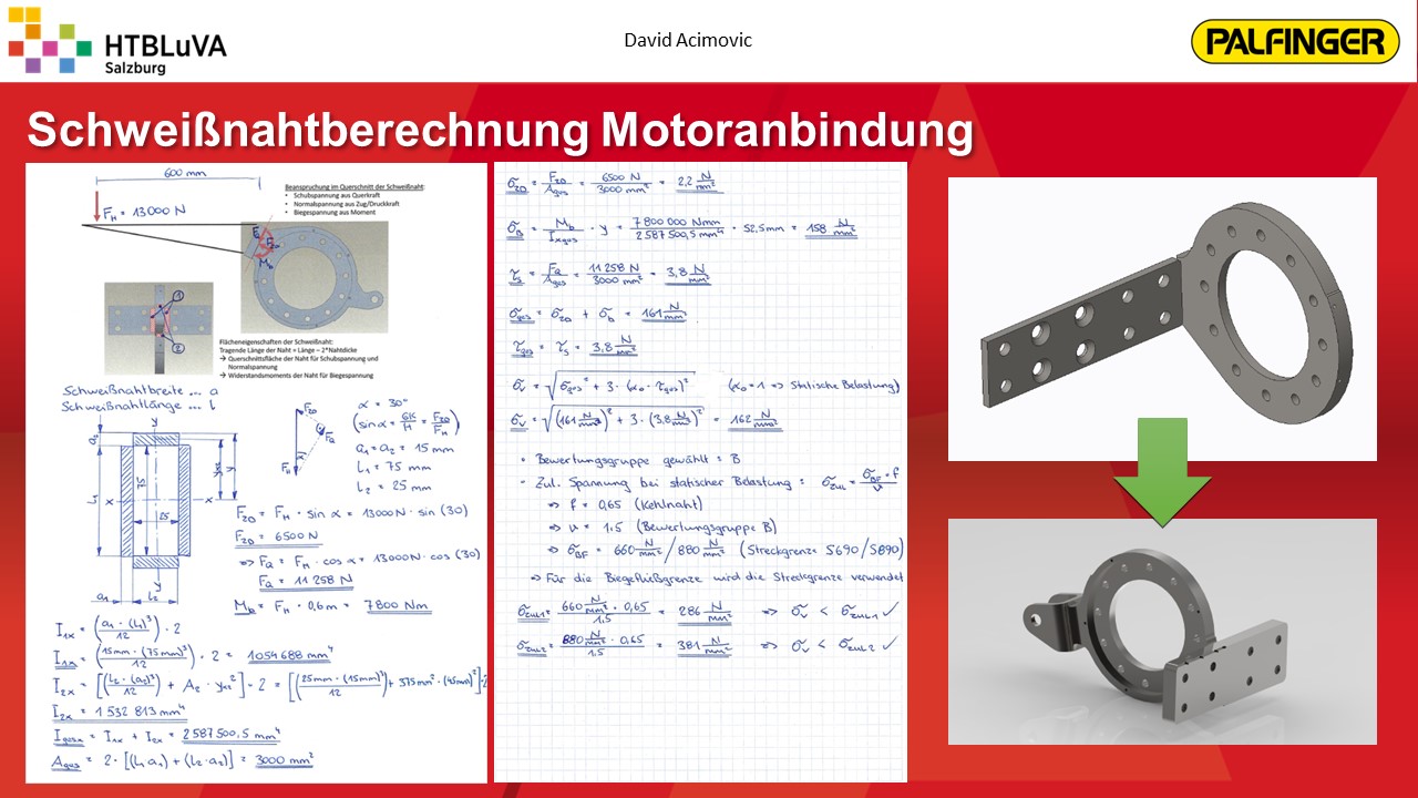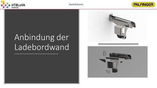 Nach einer sehr intensiven Konzeptphase wurde mithilfe der Firmenbetreuer aus mehreren Konzepten die beste Lösung erarbeitet. Es handelt sich hierbei um eine Kombination aus Seilzugsystem und Drehantrieb, welche die Bewegung der Ladebordwand bewerkstelligen soll. Anschließend wurde das Projekt in drei Hauptbereiche unterteilt. Jedes Teammitglied übernahm die Verantwortung für eines dieser Bereiche. Für die Realisierung der Gesamtkonstruktion und die Finite-Elemente-Analyse wurde ,,Creo Parametric 4.0‘‘ verwendet. Für Berechnungen und die Darstellung von Diagrammen war ,,PTC Mathcad Prime‘‘ sehr hilfreich.