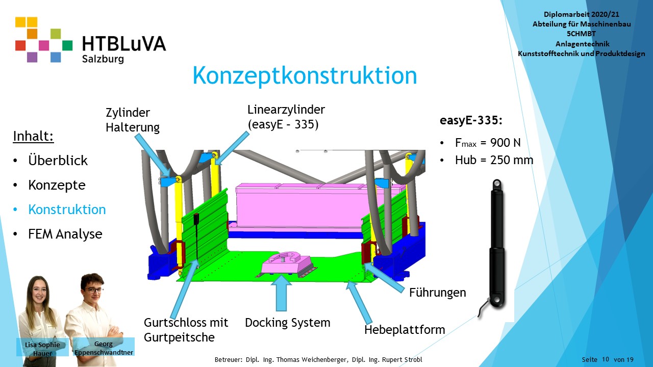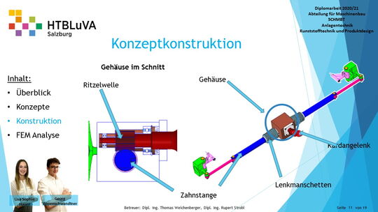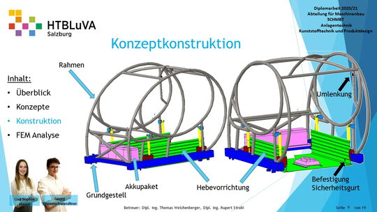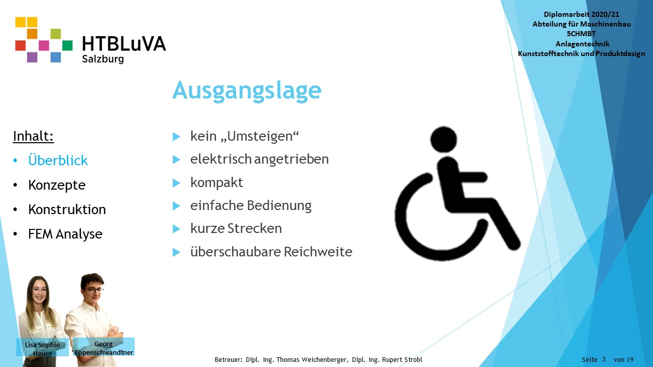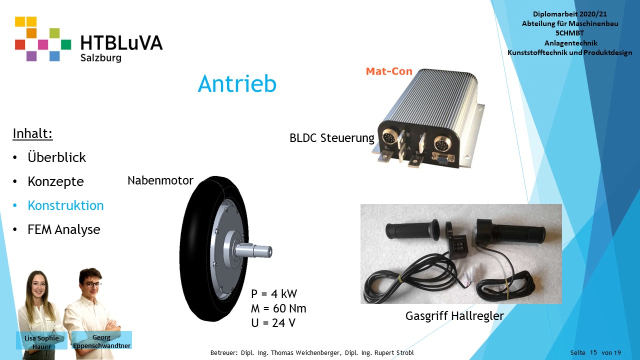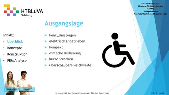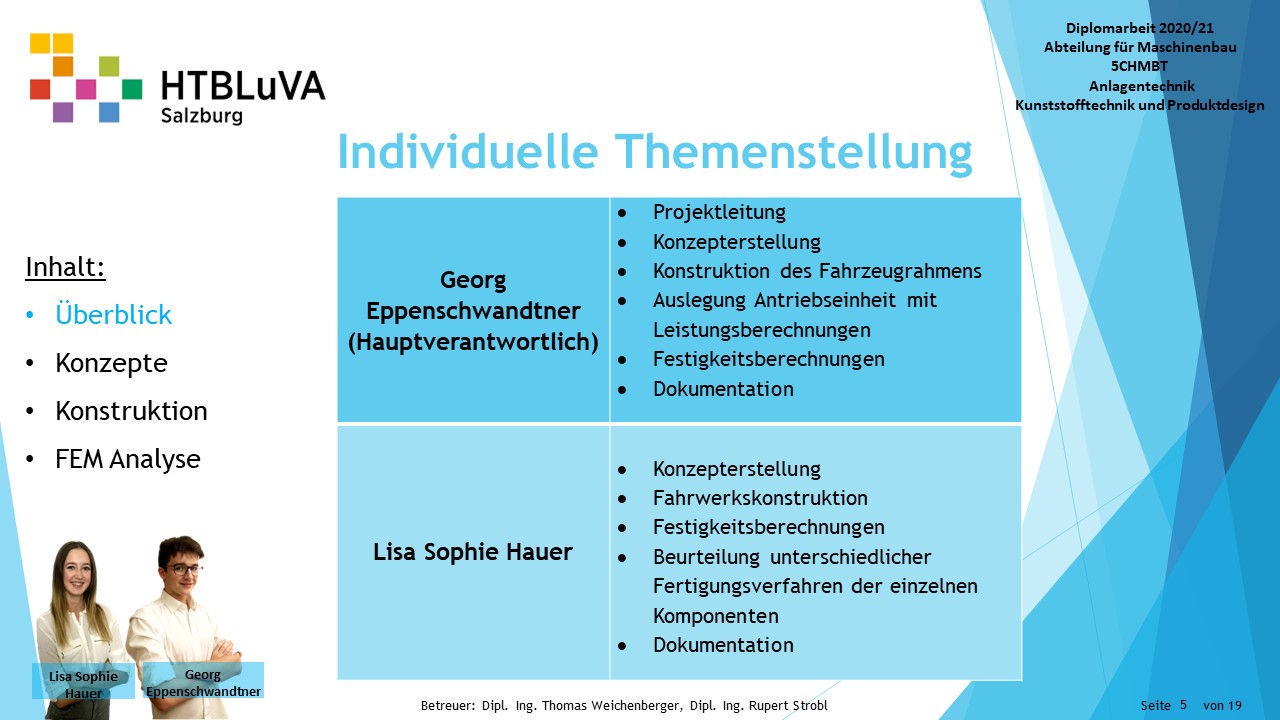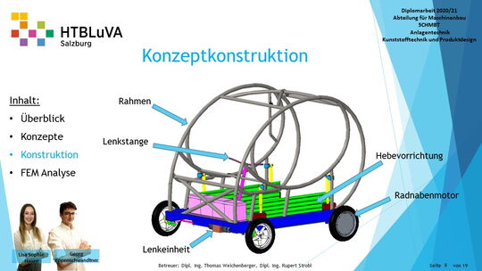 Nach dem Entwurf verschiedener Konzepte wurden diese bewertet um so das beste Konzept zu finden. Anschließend wurden relevante Komponenten vordimensioniert und anhand der gewonnenen Daten konstruierten wir den Fahruntersatz. Außerdem wurde eine Antriebseinheit ausgelegt, sowie ein Festigkeitsnachweiß mit Hilfe der FEM Analyse durchgeführt. Abschließend wurde eine Leistungsberechnung und eine Beurteilung der unterschiedlichen Fertigungsverfahren der einzelnen Komponenten erarbeitet.