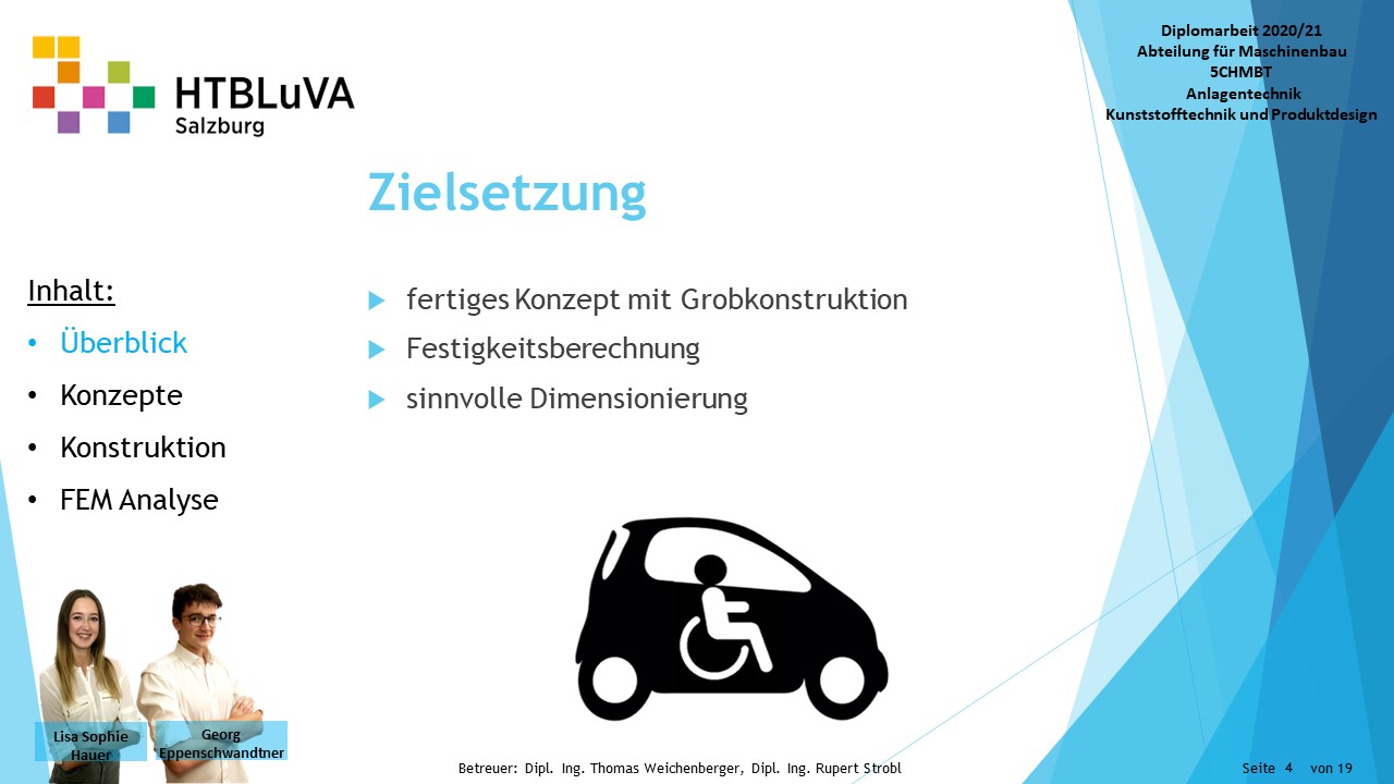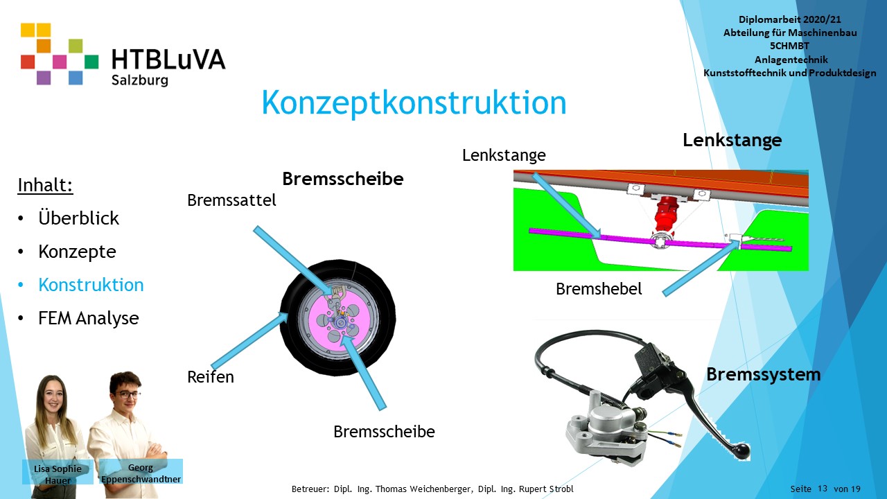 Das Ergebnis der Diplomarbeit ist ein fertiges Konzept mit vorliegender Grobkonstruktion des gesamten Fahrzeuges unter Berücksichtigung der gestellten Anforderungen werden. Alle relevanten Komponenten wurden hinsichtlich Festigkeit und unter Berücksichtigung von fertigungstechnischen und wirtschaftlichen Einflussgrößen dimensioniert.