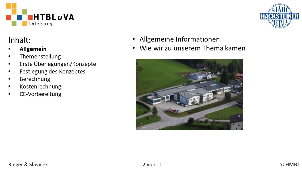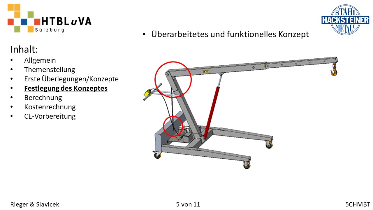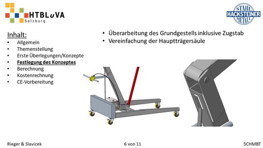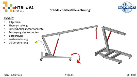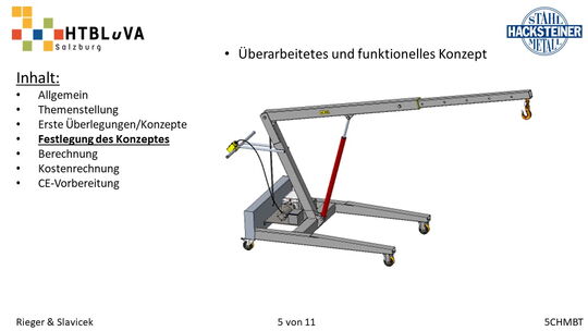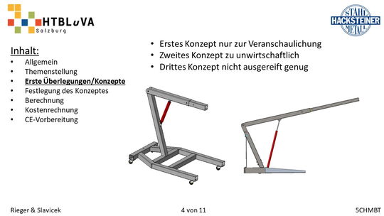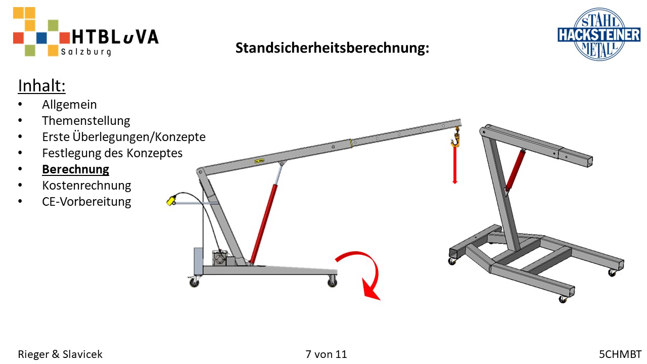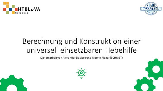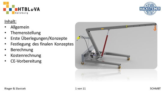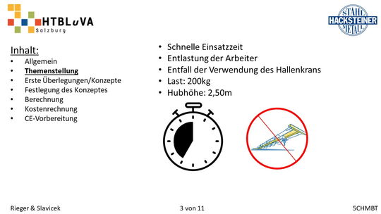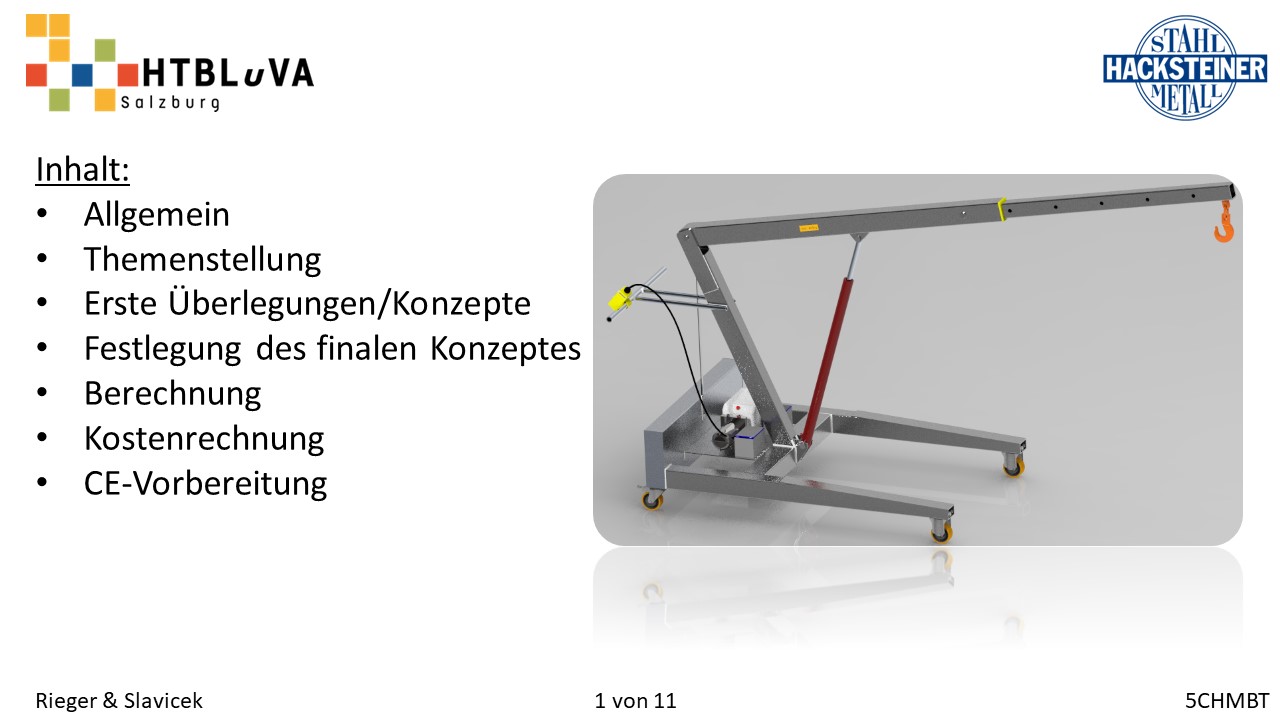 Im Rahmen des Abschlussschuljahres 2020/21 haben wir uns dazu entschlossen als Diplomarbeit im Auftrag der Firma Hacksteiner Metall GmbH eine universell einsetzbare Hebehilfe zu konstruieren. Diese muss speziell an die Bedürfnisse der Firma angepasst werden (siehe 2.2 Anforderungen und Besonderheiten), um Mitarbeiter zu entlasten und Produktionszeiten zu verkürzen. Sie soll hauptsächlich eingesetzt werden, um Biegeteile ohne Einsatz des Hallenkrans zu und von der Biegemaschine zu befördern. Jedoch soll es auch möglich sein, Fahrzeuge zu be- und entladen, folglich ist die Mobilität und schnelle Einsatzzeit der Hebehilfe ein nicht unwichtiges Kriterium.