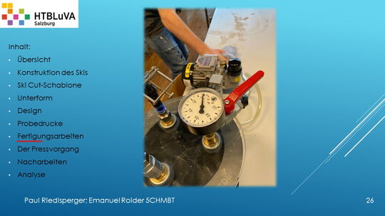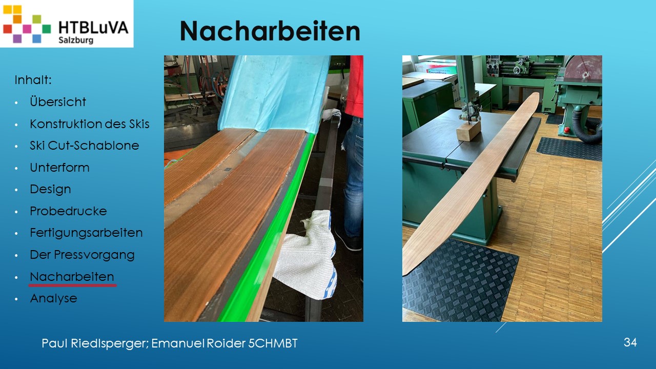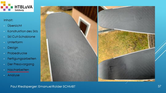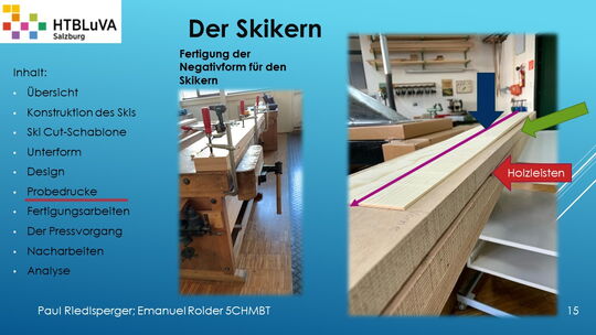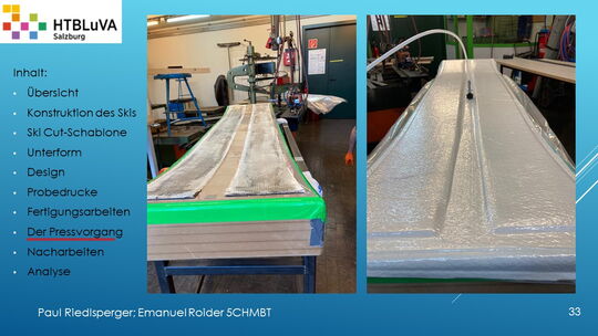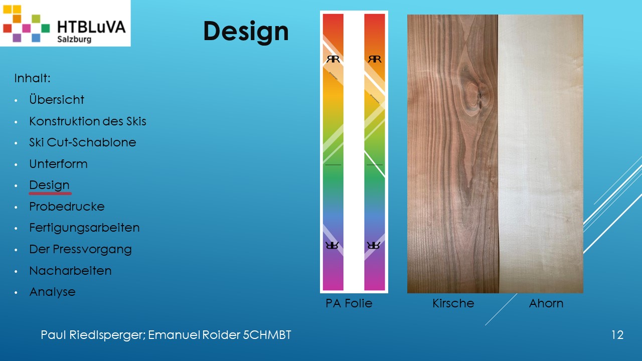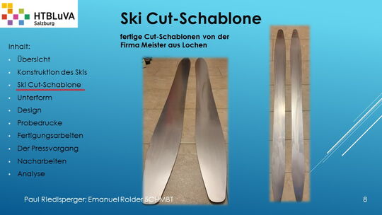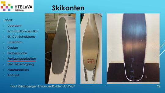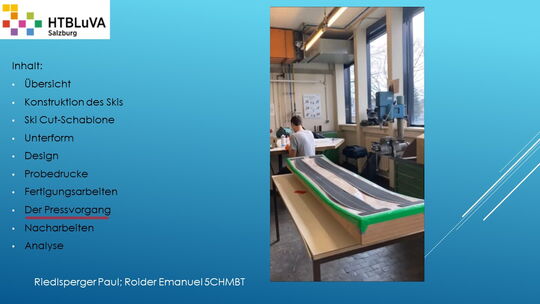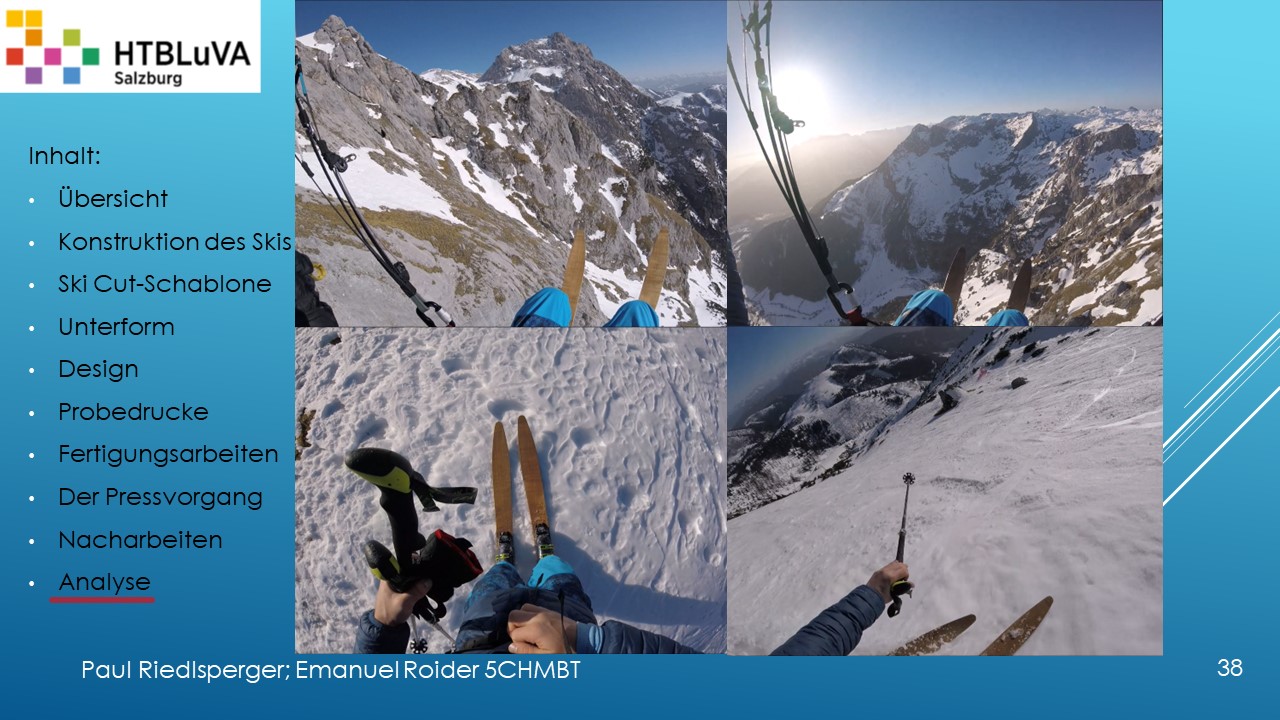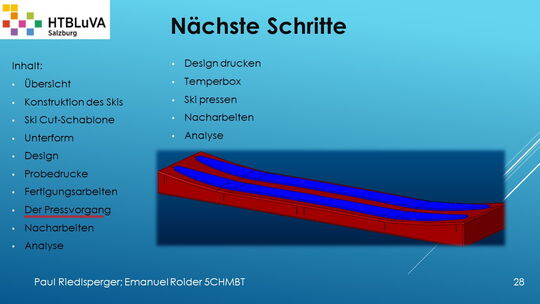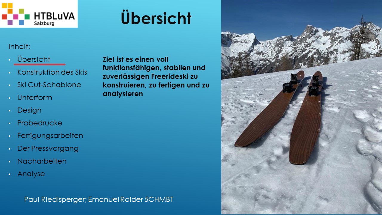Hauptaufgabe unserer Diplomarbeit ist es, einen Ski in Zusammenarbeit mit Prof. Mag. Daniel Feichtinger von Grund auf zu planen, zu fertigen und zu analysieren. Um einen flexiblen und gleichzeitig sehr strapazierfähigen Ski entwerfen zu können, sind der Aufbau, das Material und die Form entscheidend für das optimale Verhalten im freien Gelände. All diese komplexen Konstruktions-, Planungs- und Fertigungsschritte werden wir anhand der Diplomarbeit umfangreich behandeln und optimieren.