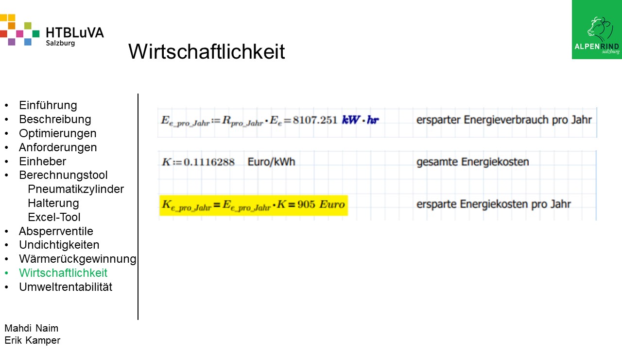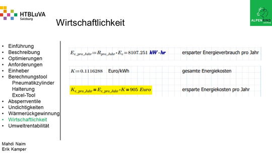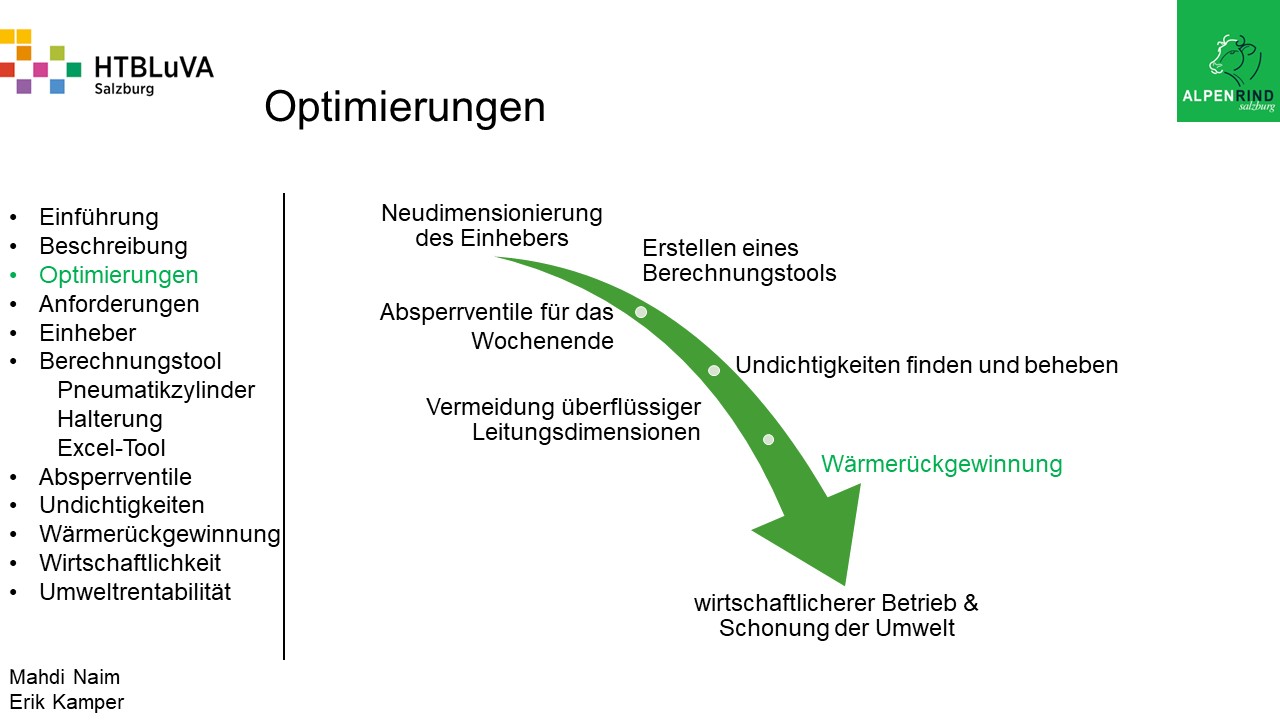 Um der Firma einen rentablen Betrieb zu gewähren, waren Tätigkeiten aus vielen Bereichen der Technik notwendig. Zur Senkung des Betriebsdruckes wurde der Einheber-Zylinder optimiert, da diese Anlage mehr Druck als alle anderen Anlagen benötigte. Durch unsere Optimierung wird der gesamte abgegebene Betriebsdruck gesenkt und somit werden die Drosseln an den anderen Maschinen hinunter geregelt. Weiters werden durch einen niedrigeren Druck die Maschinen geschont und dadurch gäbe es weniger Reparaturarbeiten und somit auch geringere Materialkosten, jedoch liegt unsere Motivation in der Schonung der Umwelt. Außerdem wurden weitere Optimierungen durchgeführt, um einen rentablen