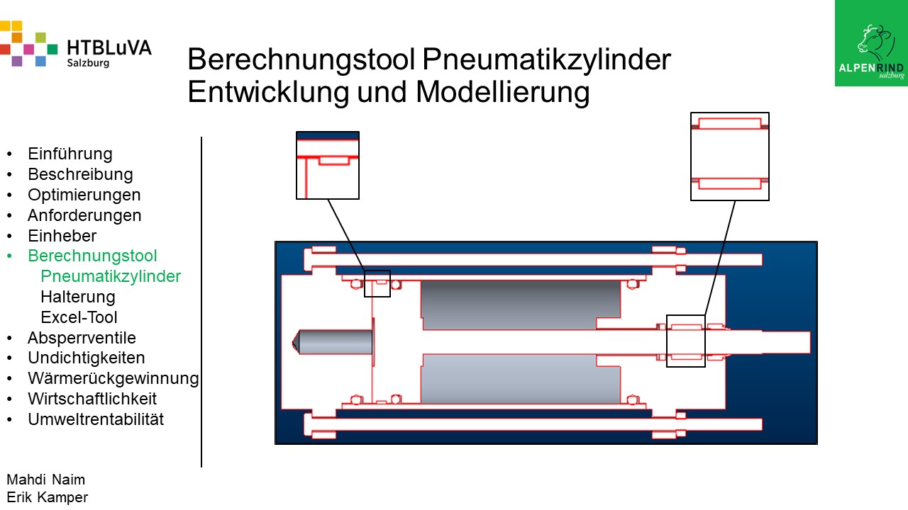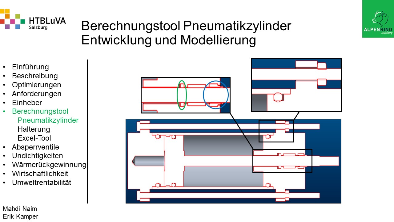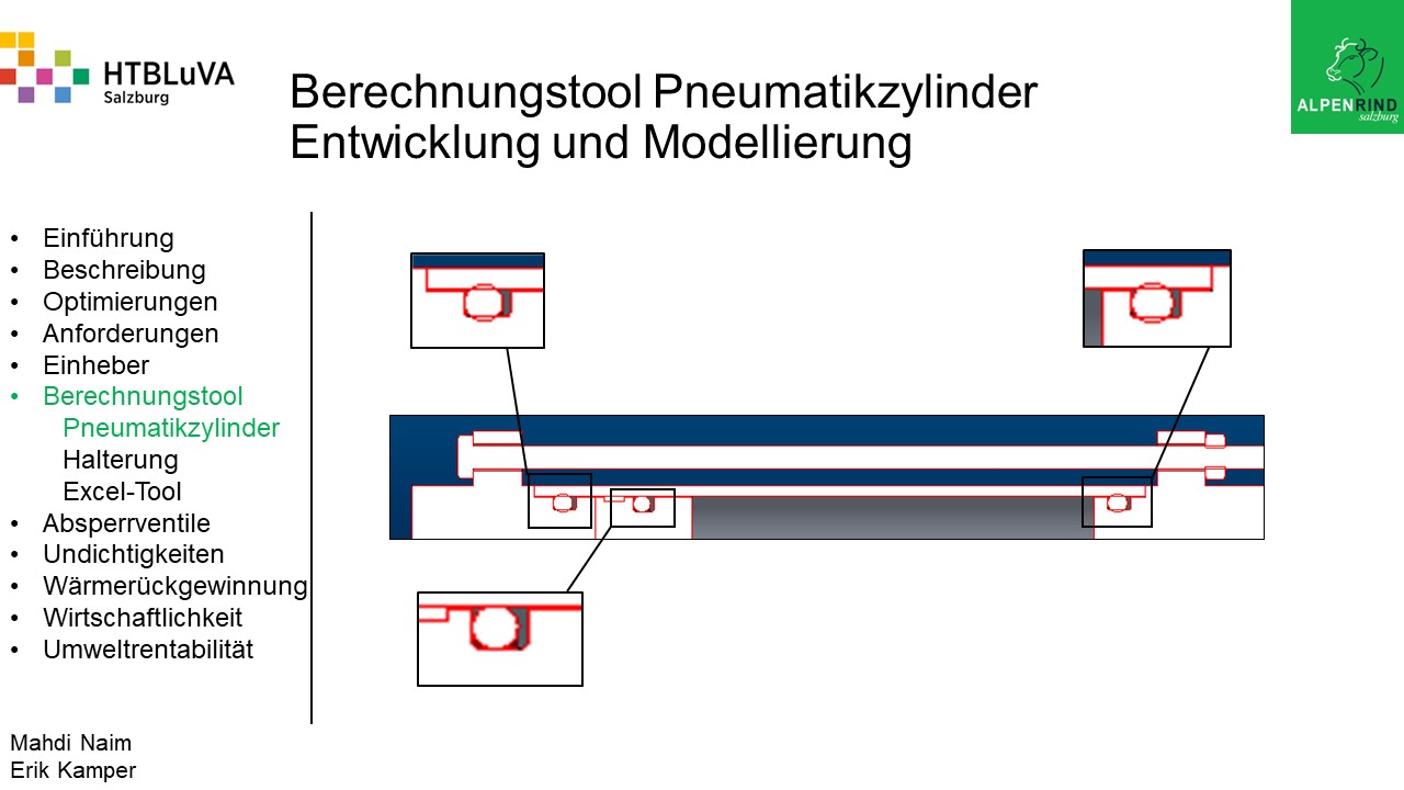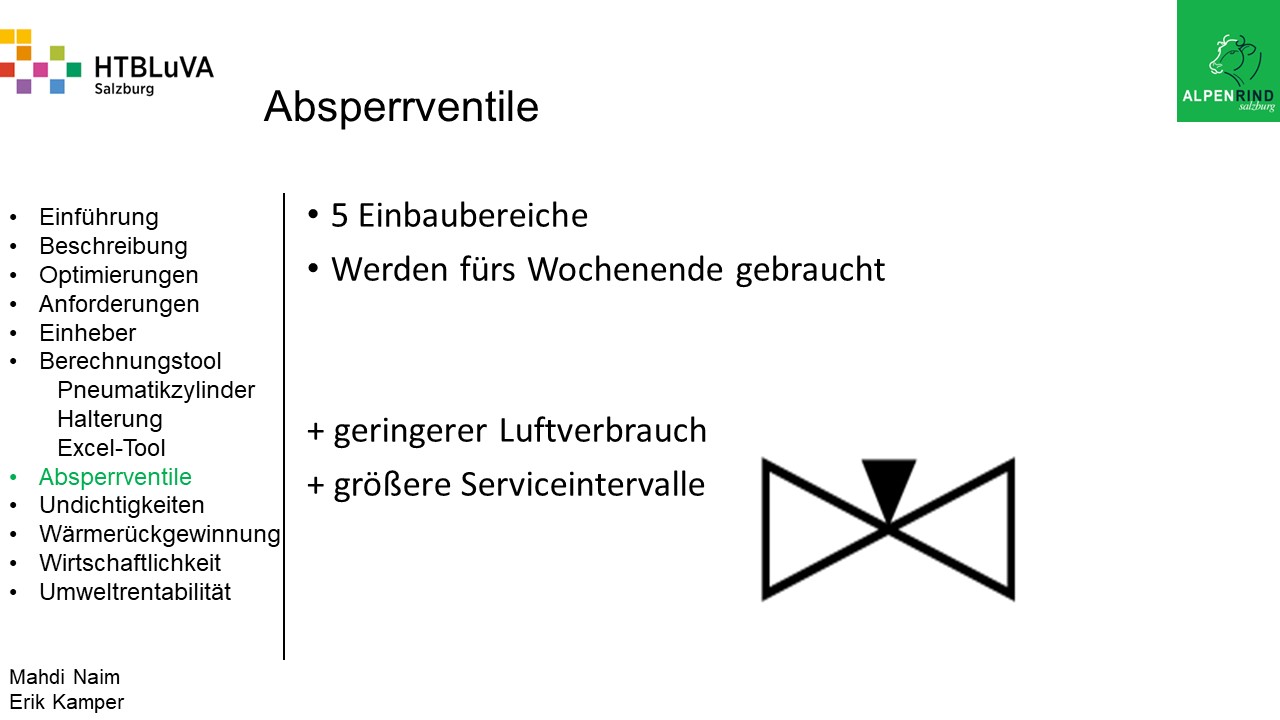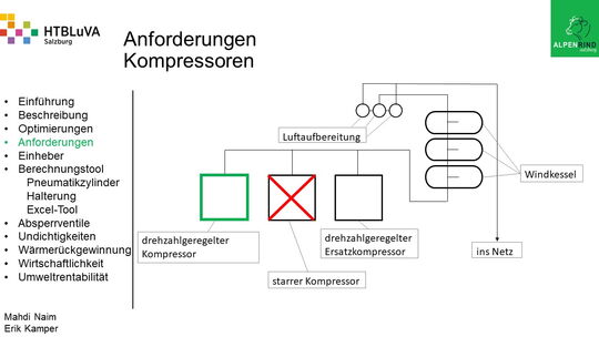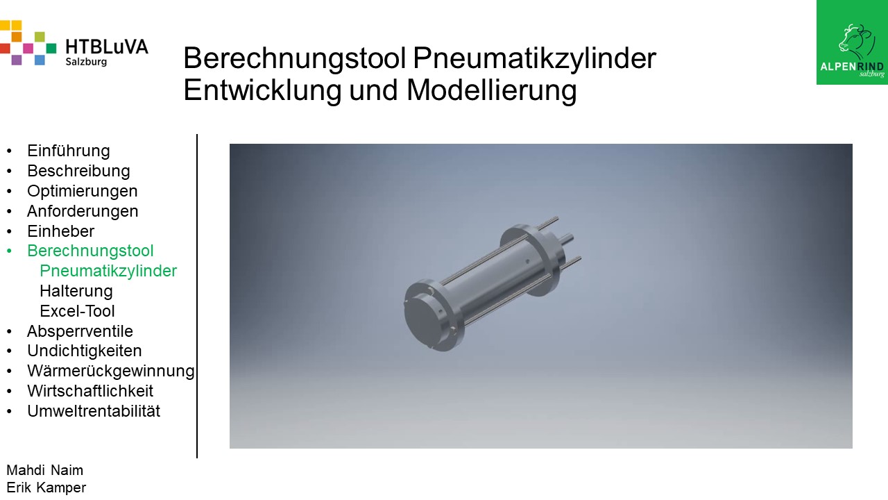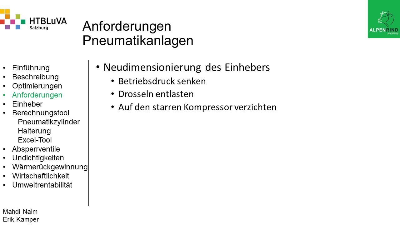 Die Firma Alpenrind betreibt verschiedene Pneumatik Anlagen. Dabei tritt das Problem auf, dass durch unterschiedlich hohe Druckniveaus hohe Energieverluste auftreten. Die Aufgabe ist es, die Pneumatik Anlagen neu zu dimensionieren und konstruktiv anzupassen, um die Verluste zu minimieren.