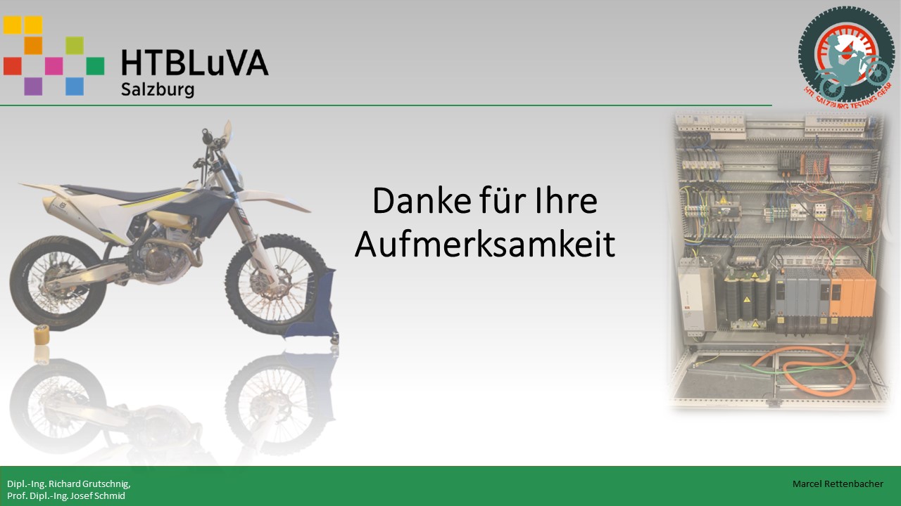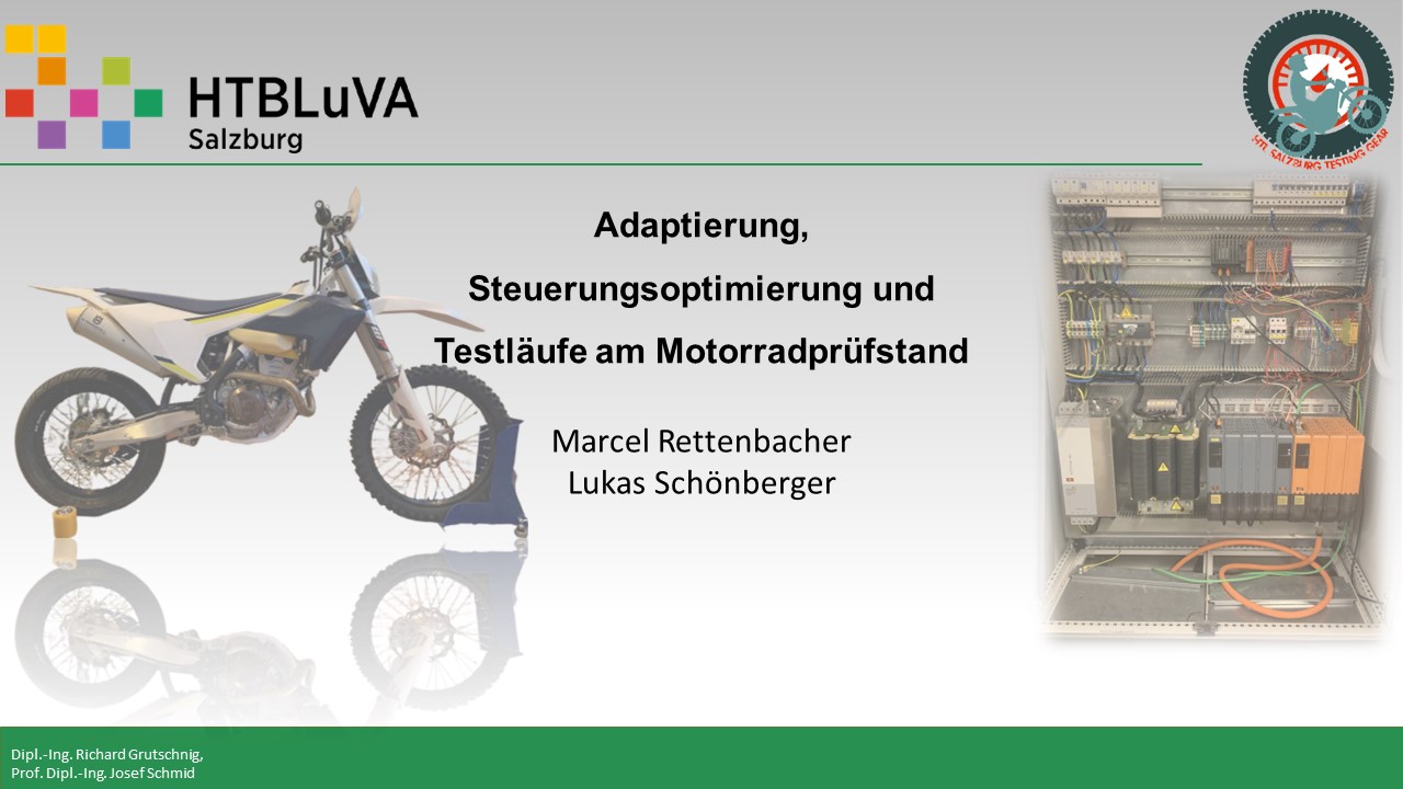 Ein bereits vorhandener Motorradprüfstand der HTBLuVa Salzburg soll konstruktiv und steuerungstechisch finalisiert werden. Testläufe mit daraus gelesener Drehmomenten Kurve sind zu erstellen. Sicherheitstechnische Aufgaben werden in einer Bedienungsanleitung und Mustertestlauf bereitgestellt.