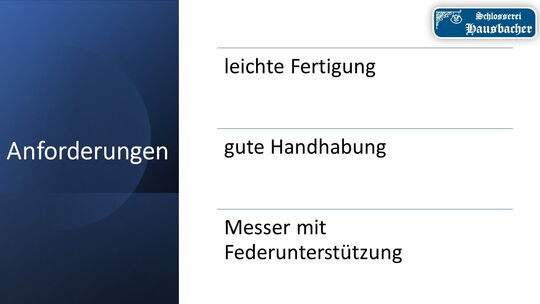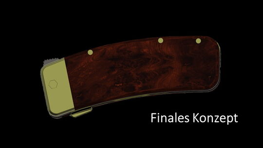 Es wurde ein neues Klappmesser, welche alle Vorgaben von Herrn Haubacher erfüllt und konstruiert. Dazu soll zuerst eine ausführliche Werstoffanalyse erfolgen, um die exakte Werkstoffzusammenzetzung ausfindig machen zu können.