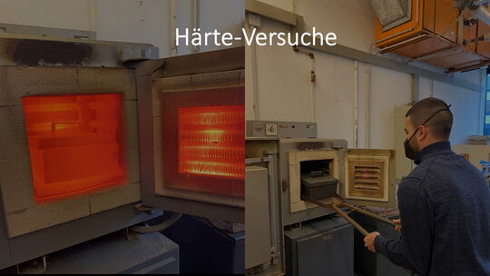 Vergleich zwischen härten mit Schmiedeesse und Härteofen. Beide Verfahren weisen gleiche Härteergebnisse auf. Konstruktion des Klappmessers und Prototypenbau für die öffentliche Präsentation.