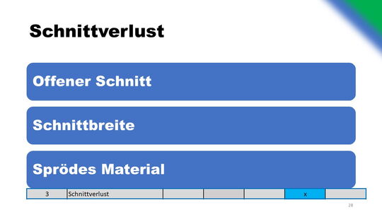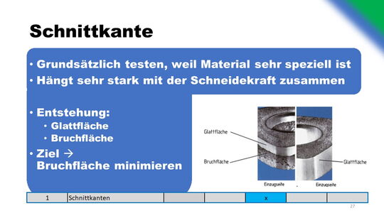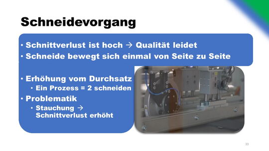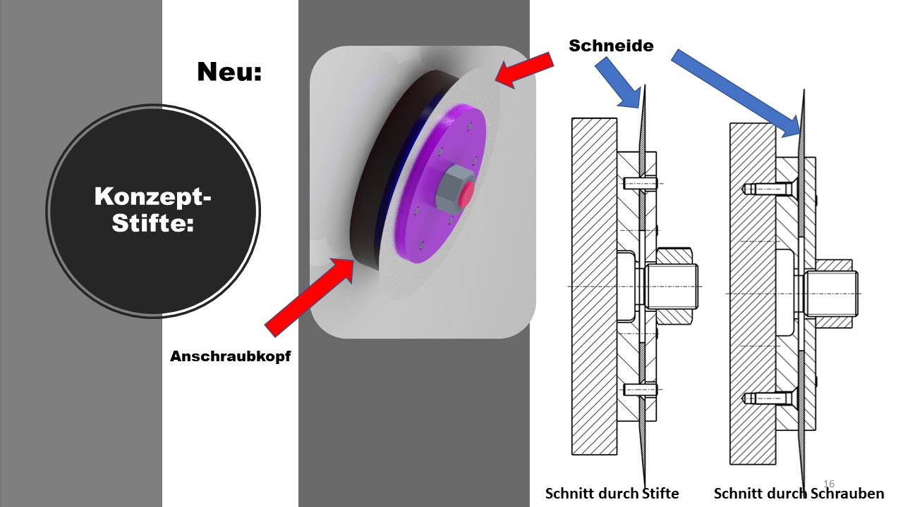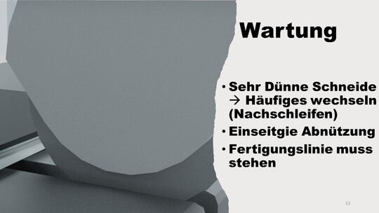 Drei alternative Schneidekonzepte wurden ausgearbeitet und verglichen. Optimierungen bezüglich des Verschleißes und der Wartung wurden konzeptioniert. Gegenüberstellung