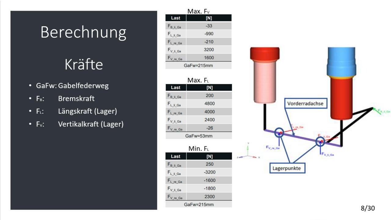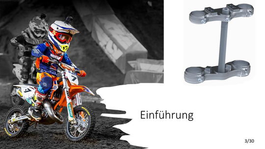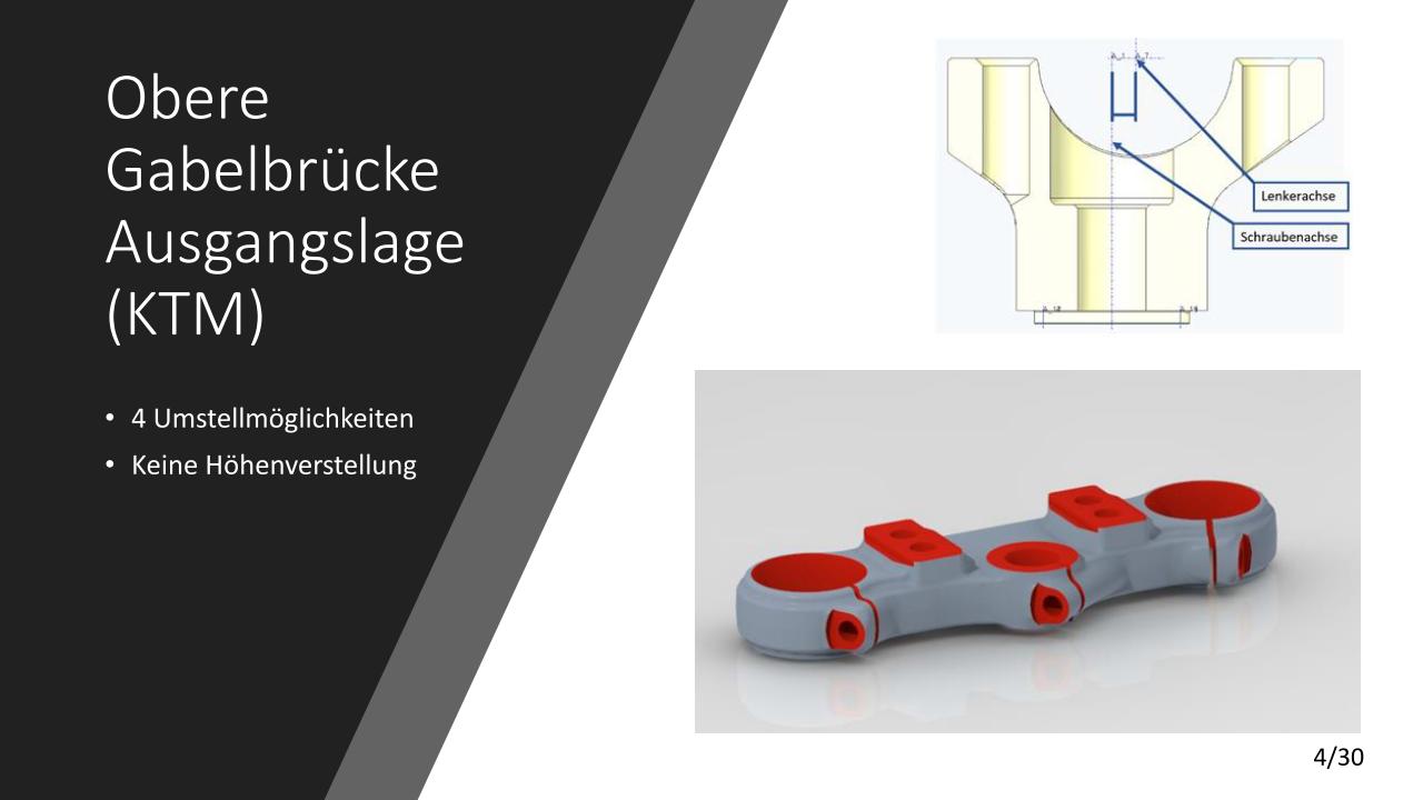 Es soll eine konstruktive Lösung gefunden werden, um bei der oberen Gabelbrücke die Tauchrohrbohrungen um ca. 10mm nach unten zu versetzten. Zudem sollen Ideen für eine Lenkerverstellbarkeit ausgearbeitet werden. An der unteren Gabelbrücke soll die Ovalisierung untersucht werden. Diese wird durch Lage und Anzahl der Schrauben beeinflusst.