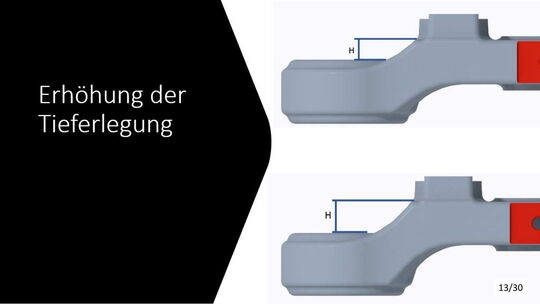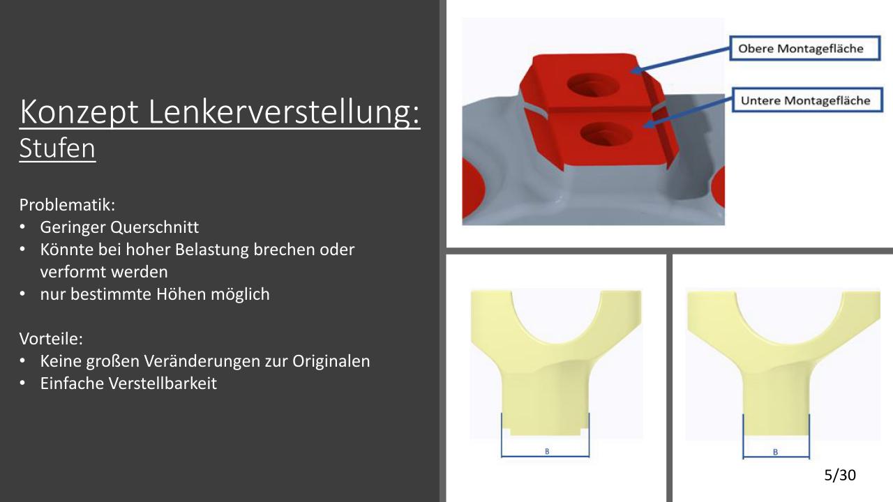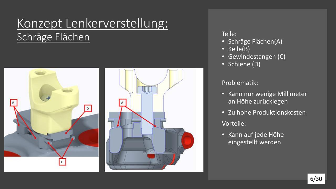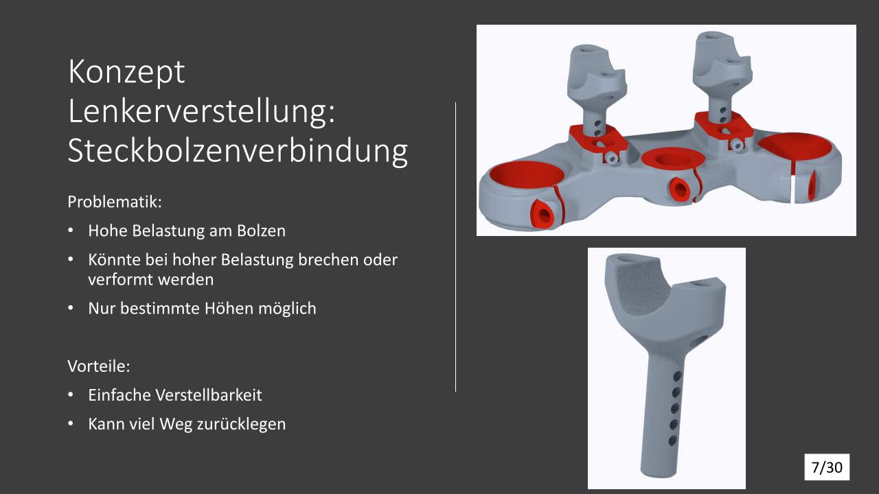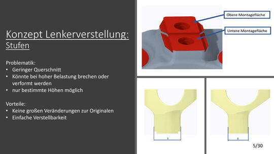 Für die Tieferlegung wurde zuerst ein Konzept überlegt. Dieses Konzept wurde mit Creo Simulate durchgerechnet und mit den daraus resultierenden Ergebnissen optimiert. Für die Lenkerverstellbarkeit wurden vier verschiede Varianten ausgearbeitet und die Vor- und Nachteile durchdiskutiert. Für die Ovalisierung wurden auch Konzepte ausgearbeitet, welche mit Creo Simulate durchgerechnet und anschließend optimiert wurden.