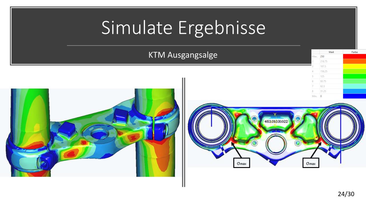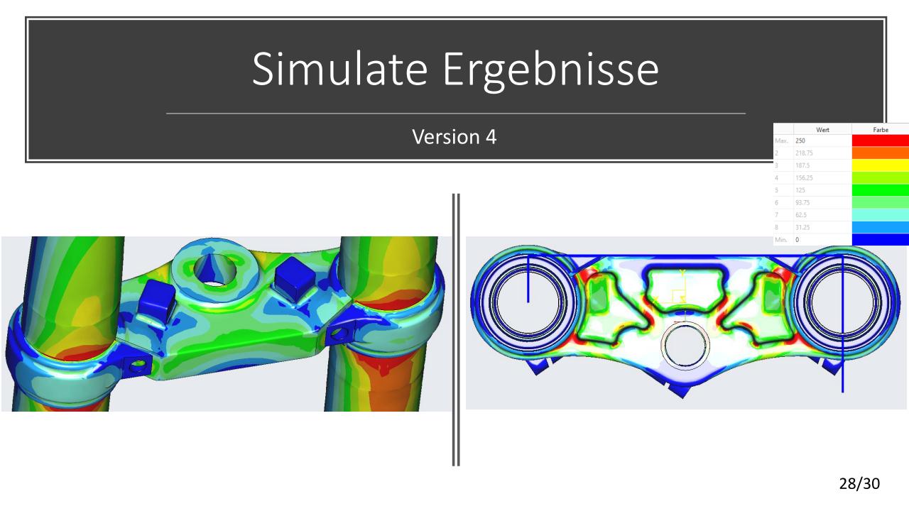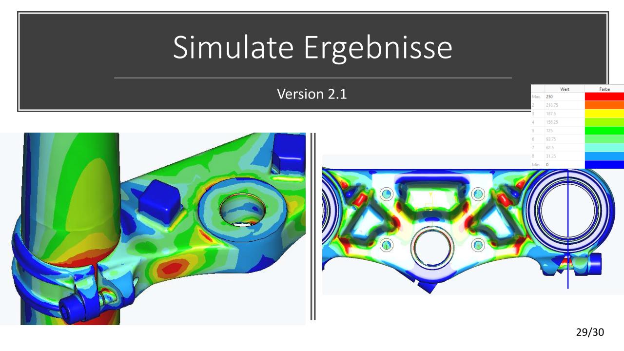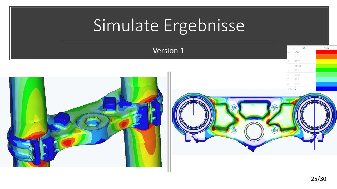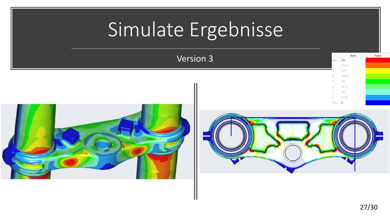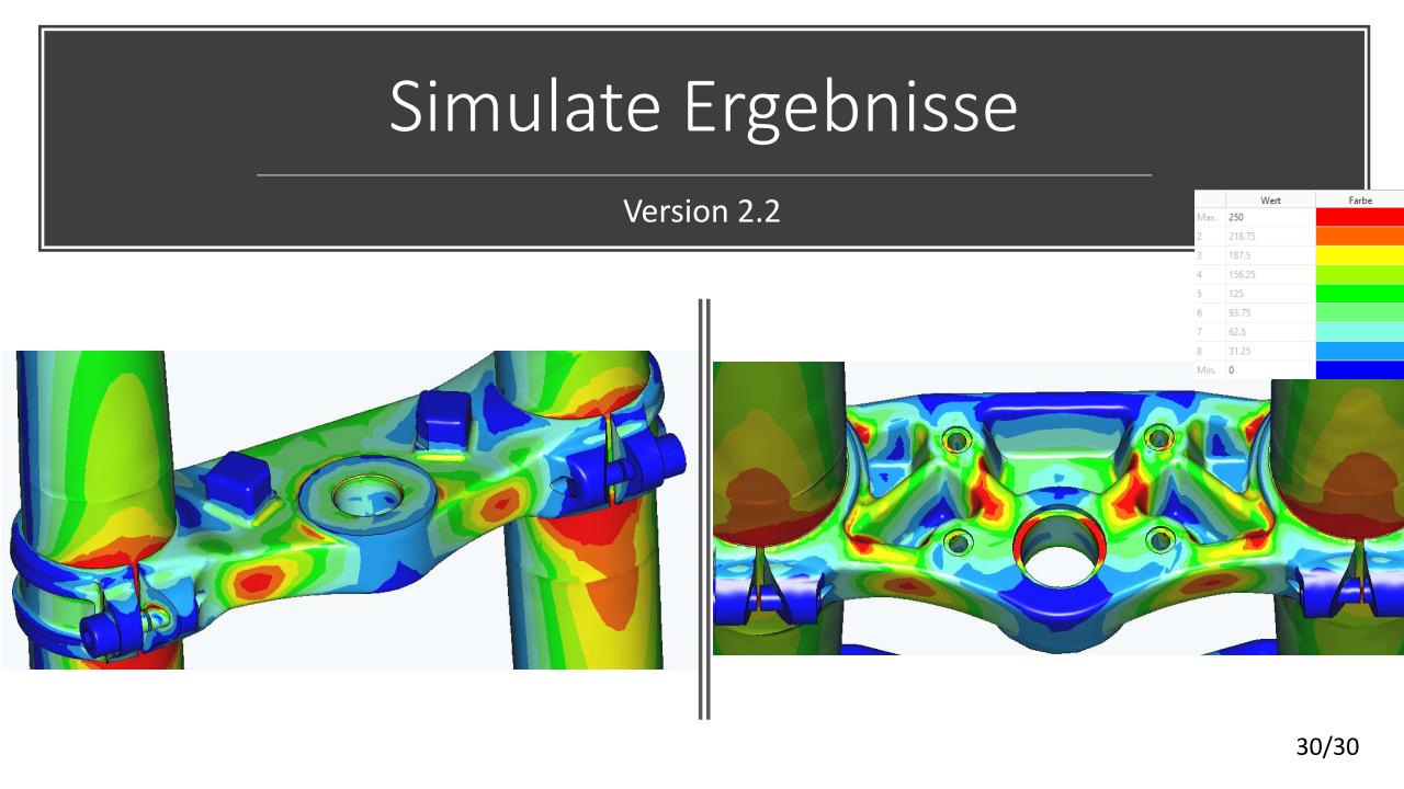 Die konstruktive Lösung für die Tieferlegung konnte umgesetzt werden. Im Vergleich zur alten Gabelbrücke konnte ein Absatz mit ca. 13mm ausgearbeitet werden. Die Ideen der Lenkerverstellbarkeit konnten aufgrund zu hohen Entwicklungsaufwandes bzw. Instabilität der Befestigung leider nicht umgesetzt werden. An der unteren Gabelbrücke wurde die Ovalisierung und Festigkeit verbessert. Die Konzepte mit zwei Klemmschrauben wurde aus kosten Gründen nicht umgesetzt.