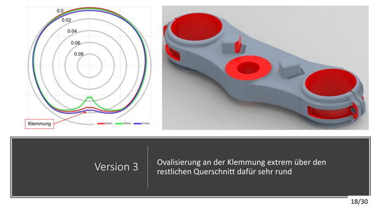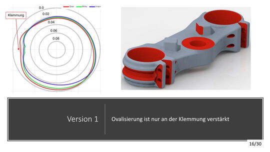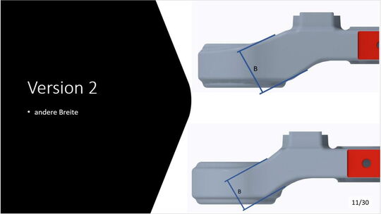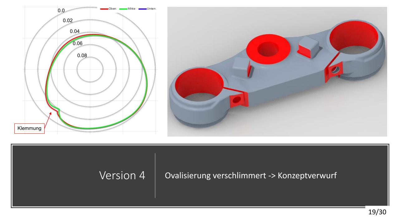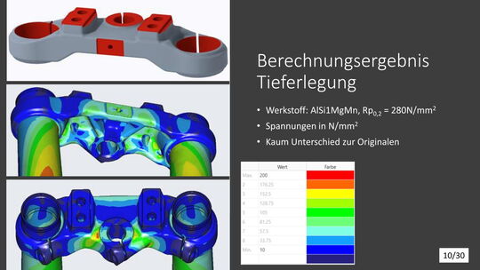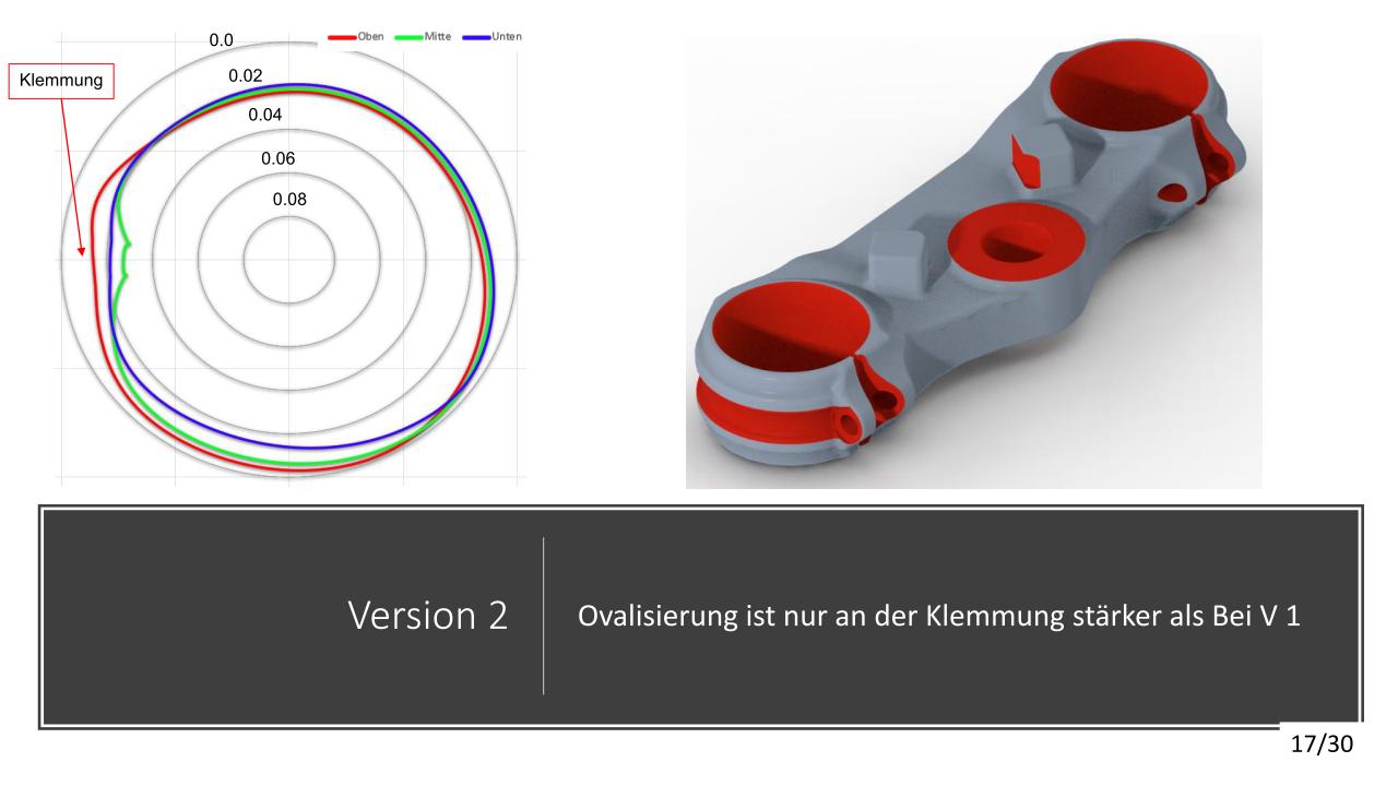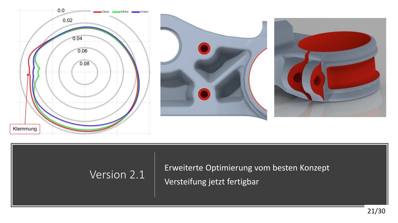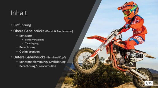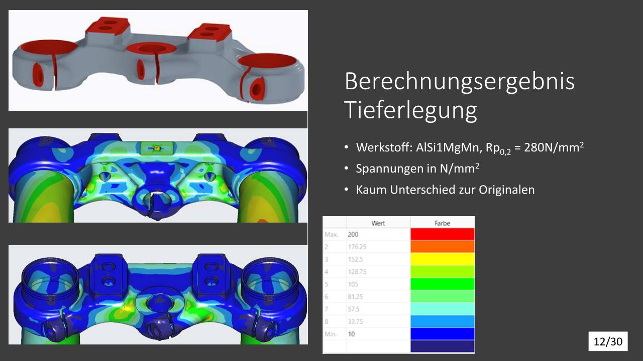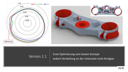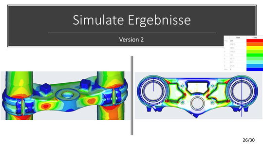 Die konstruktive Lösung für die Tieferlegung konnte umgesetzt werden. Im Vergleich zur alten Gabelbrücke konnte ein Absatz mit ca. 13mm ausgearbeitet werden. Die Ideen der Lenkerverstellbarkeit konnten aufgrund zu hohen Entwicklungsaufwandes bzw. Instabilität der Befestigung leider nicht umgesetzt werden. An der unteren Gabelbrücke wurde die Ovalisierung und Festigkeit verbessert. Die Konzepte mit zwei Klemmschrauben wurde aus kosten Gründen nicht umgesetzt.