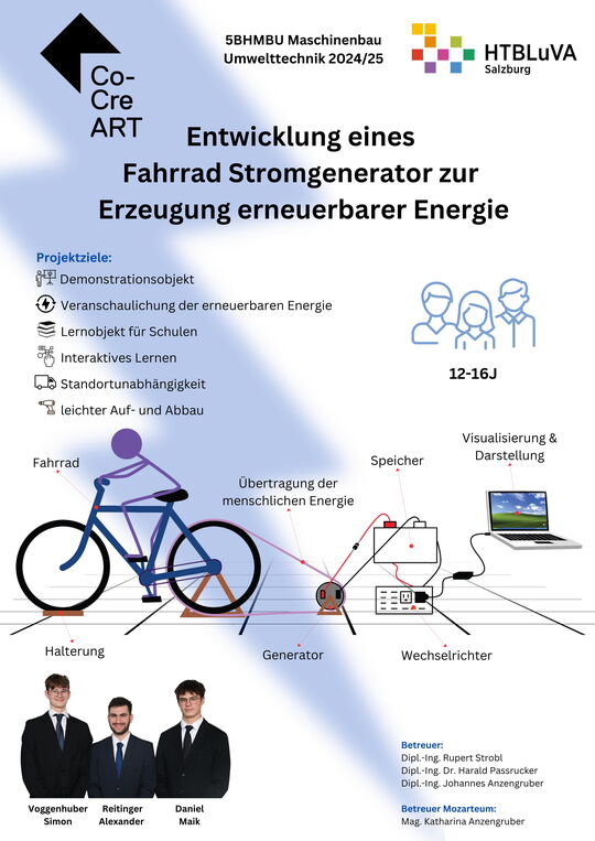 Konzeptfindung und Konstruktion eines Fahrrad-Stromgenerators mit visueller Darstellung Realisierung Planung der Konstruktion und Stromerzeugung sowie Auswahl geeigneter Materialien und einfachen Komponenten. Theoretische Erarbeitung eines Fahrradstromgenerators