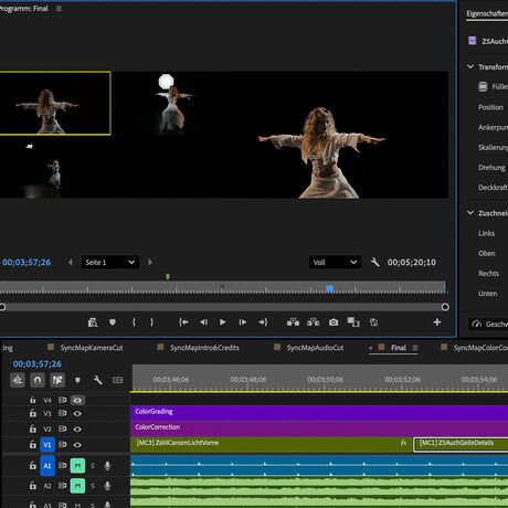 zwischenBlicken untersucht, wie Tanzperformance und Motion-Tracking-Technologie Mittel zur feministischen Selbstermächtigung werden können. Dazu wurde ein Kurzfilm produziert, in dem menschliche Bewegungen einer Tänzerin über Motion-Tracking in Elemente der Filmmusik übersetzt wurden. Die technische Umsetzung der bewegungskontrollierten Klänge erfolgte mittels einer Software-Architektur, bestehend aus Tracking- und Musikprogrammen (MediaPipe, TouchDesigner, Ableton Live). Die Methodik umfasste eine theoretische Analyse feministischer Perspektiven (Mulvey, Frederickson & Roberts, Young) sowie Kamera-, Schnitt- und Lichttechniken. Darüber hinaus wurden fünf zeitgenössische Tanzperformances und der Film Black Swan (Aronofsky) analysiert, um zu ermitteln, wie Kamerarbeit im Kontext von Performance-Kunst erfolgt und welche Klänge verwendet werden könnten, um die emotionale Wirkung auf das Publikum zu verstärken.
