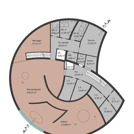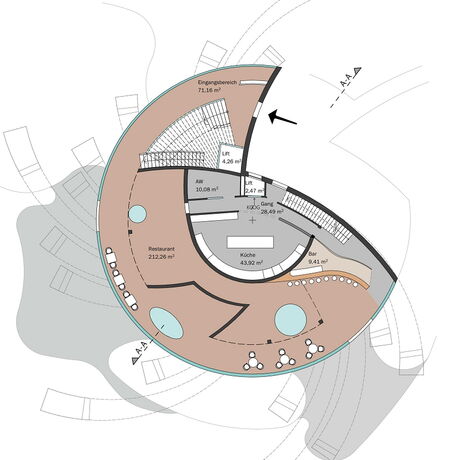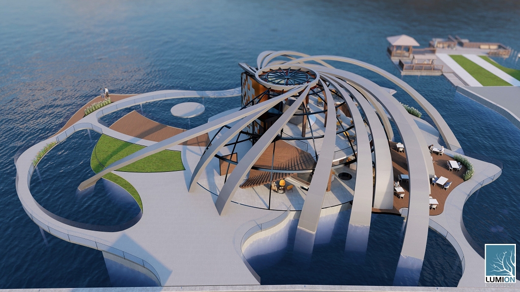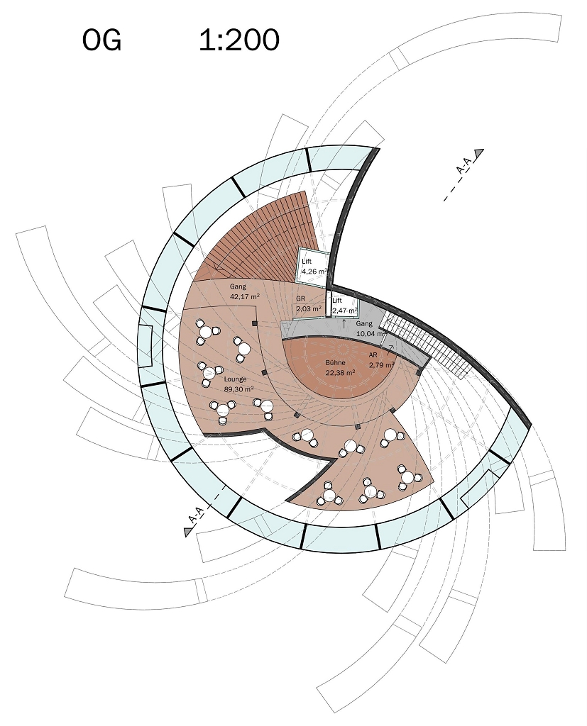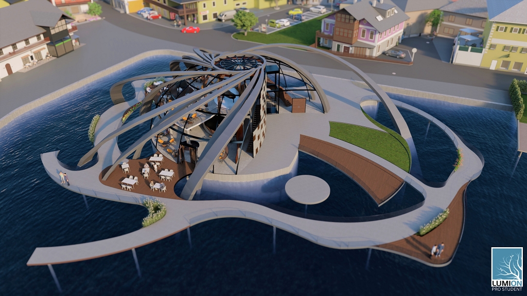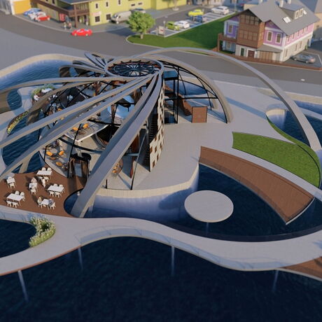 Die Grundidee für das Gebäude ist auf die Form einer Turbine zurückzuführen. Inspiration dafür war die Kaplan-Turbine, die von Viktor Kaplan, der in Unterach am Attersee gelebt hat, erfunden und entwickelt wurde. Die Streben des Gebäudes spiegeln die Form und die Bewegung von Turbinenblättern wider und das Gebäude wächst dadurch förmlich aus dem Attersee. Zusätzlich fungieren die Streben als Beschattung. Um die Atmosphäre des Attersees spürbar zu machen, entschied man sich, den einmaligen Ausblick einzufangen und das Wasser rund um das Restaurant sowie den Veranstaltungsbereich in das Projekt einfließen zu lassen.