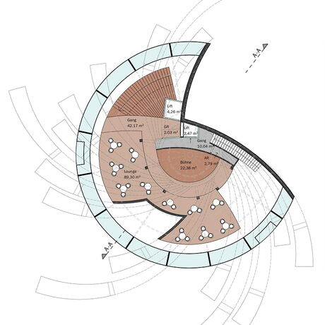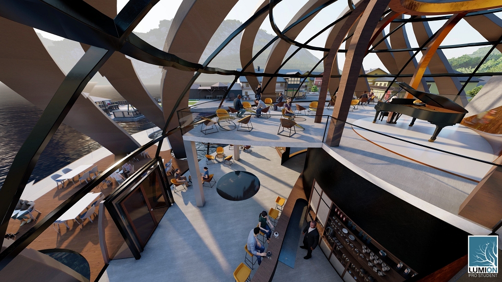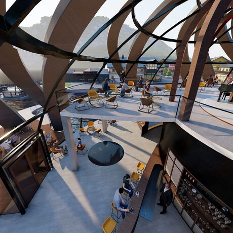 So kam der Gedanke, ein fast schwimmendes Gebäude mit Bootsanlegestellen zu errichten. Diese Idee greift auch die frühere Bezeichnung Unterachs als 'Klein Venedig' auf. Der Innenraum mit eindrucksvollen Ausblicken in die Umgebung bietet den Gästen auf zwei Etagen viel Platz. Warme, goldorange Farbtöne nehmen Bezug auf den untrennbar mit dem Attersee verbundenen Maler Gustav Klimt und schaffen gleichzeitig ein einzigartig harmonisches Ambiente. Für Veranstaltungen unter freiem Himmel schwebt eine kreisförmige Bühne direkt über dem Wasser. Das Publikum sitzt in einem eigens gestalteten Bereich gegenüber.