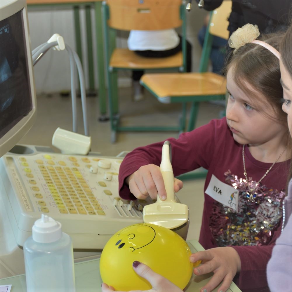 Die Mädchen durften sich zu Beginn des Forschertages jeweils eine Schülerin oder einen Schüler aus der dritten Klasse 3AHBG unserer Abteilung als ihre persönliche Mentorin oder Mentor aussuchen. Mit ihnen an der Seite wurde mit Begeisterung erprobt, wie zum Beispiel mit einem Ultraschallgerät Gegenstände in einem mit Wasser gefüllten Luftballons zu erkennen sind.
