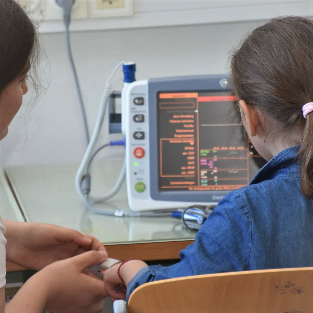 An einer weiteren Station detektierte ein Fingerclip an der Hand der Minis den Herzschlag und machte ihn auf einem Monitor sichtbar.