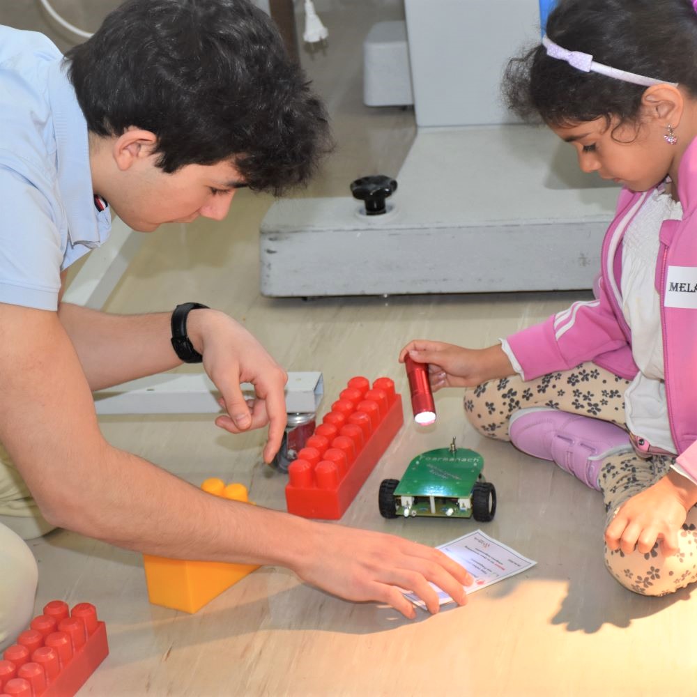 Geschickt geleitet folgten mehrere lichtfolgende Roboter den Taschenlampenlicht der Kinder durch einen Parkour aus Bausteinen ans Ziel.