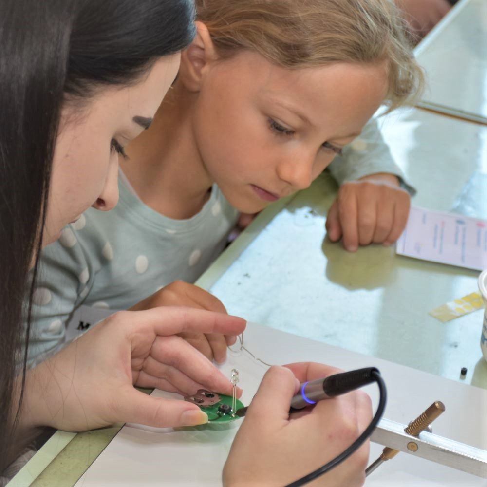 Eine besonders beliebte Station stellte das Einlöten einer Leuchtdiode in eine Platine dar. Unter fachkundiger Hilfe einer Schülerin aus der dritten Klasse der Abteilung Biomedizintechnik und Gesundheitstechnik wurde eine Platine gefertigt, an der die LED auf Knopfdruck die Farbe automatisch verändert. Stolz nahmen die Kinder dieses Geschenk mit nach Hause.